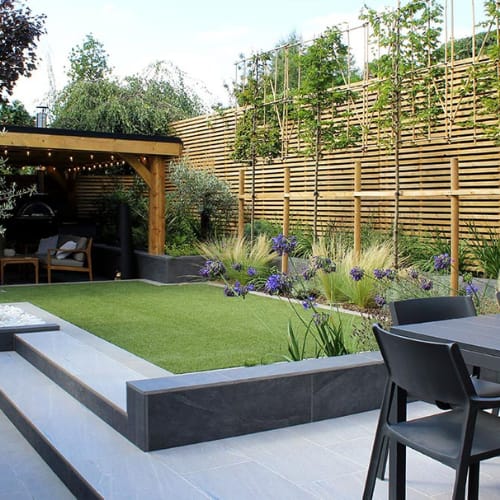 - Porcelain paving for low-maintenance terraces; natural stone for heritage character