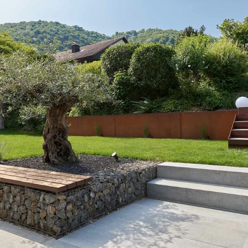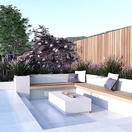 - Bespoke hardscape features: seating walls, planters, fire pits, coping