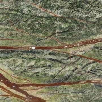 Rainforest Green Marble is a natural Indian marble characterised by deep green backgrounds with brown, red, or black root-like veining and subtle white highlights. Each slab is unique — the “forest” appearance comes from mineral impurities and crystallisation patterns in the stone.