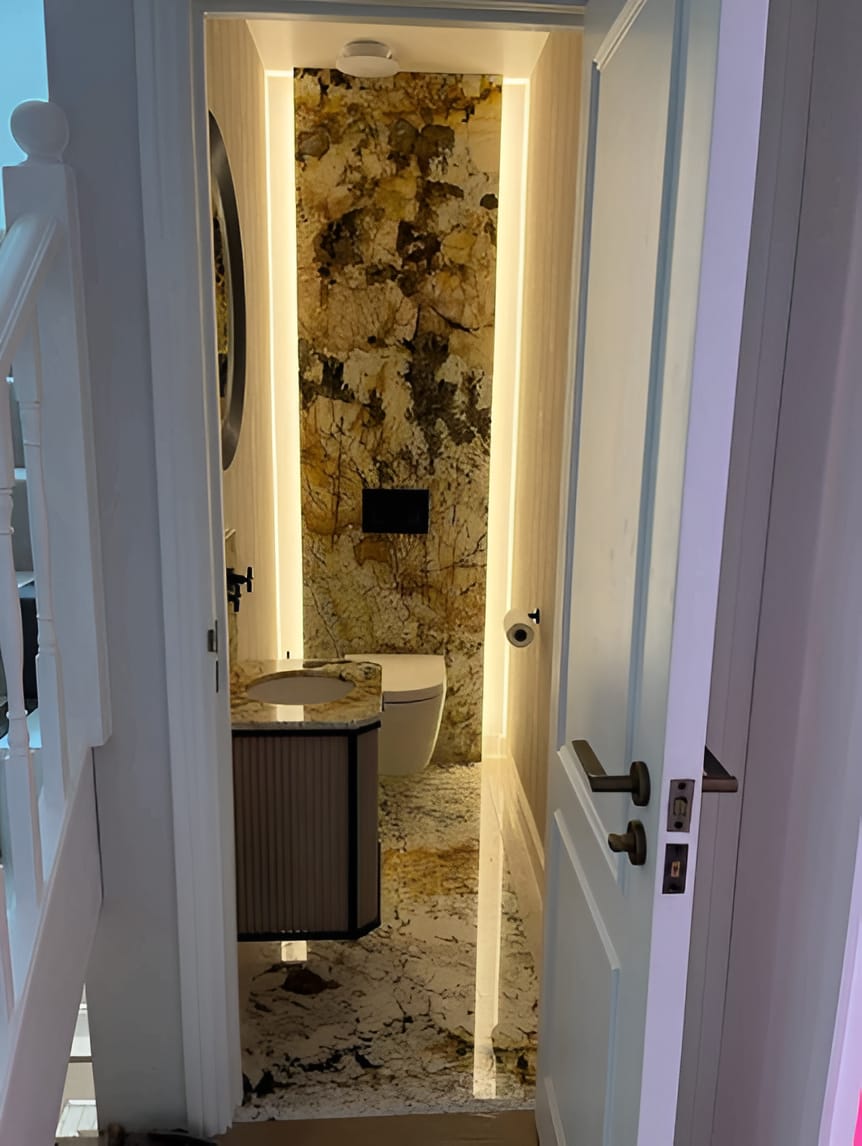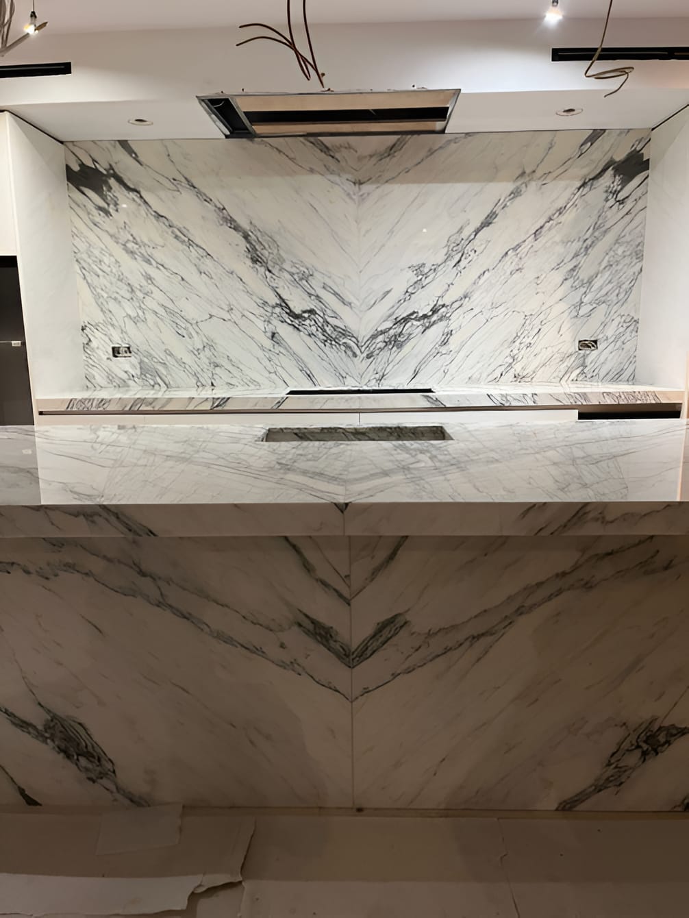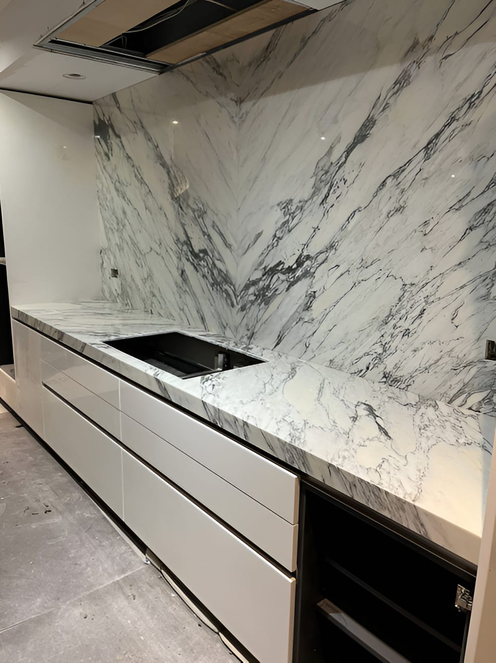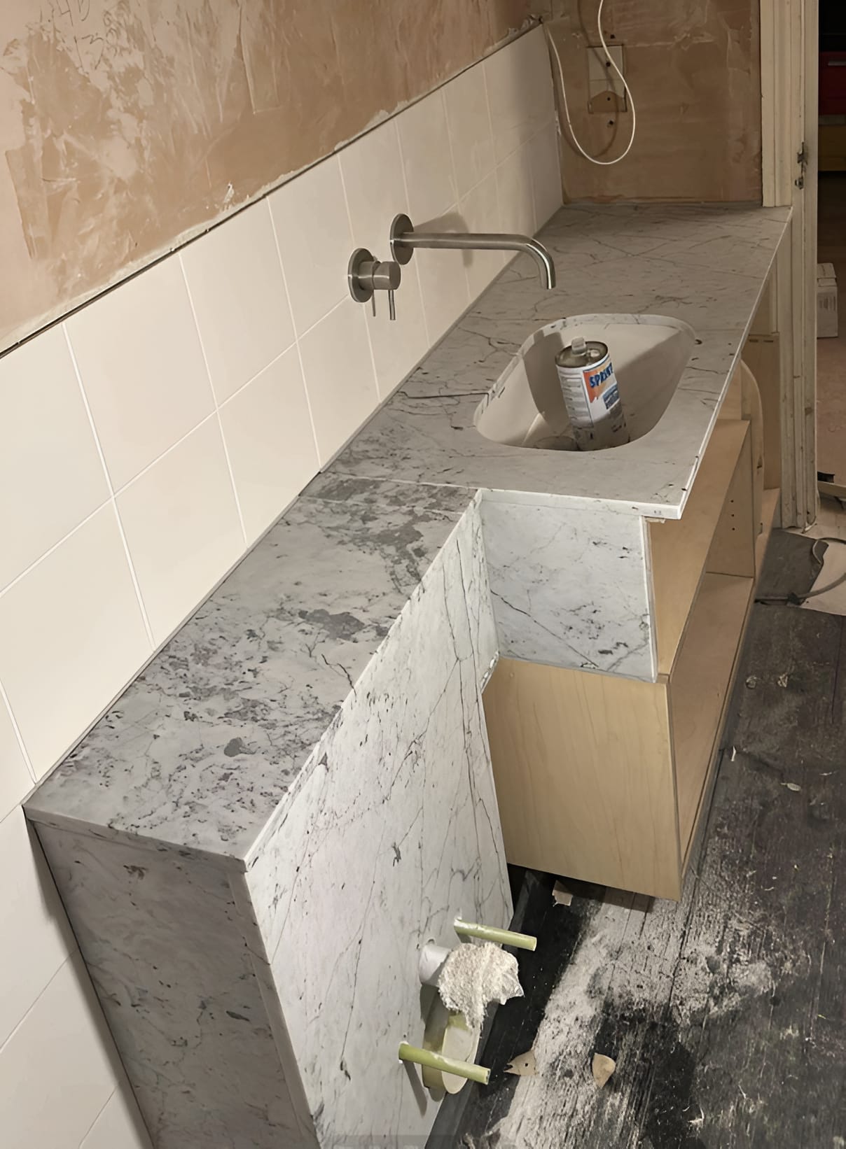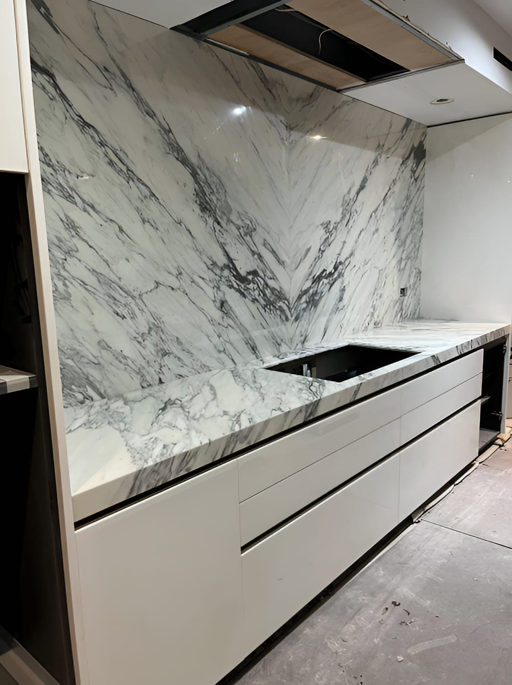 This project combines kitchen worktops and bathroom vanity in a Carrara-style marble, offering a timeless white and grey aesthetic.