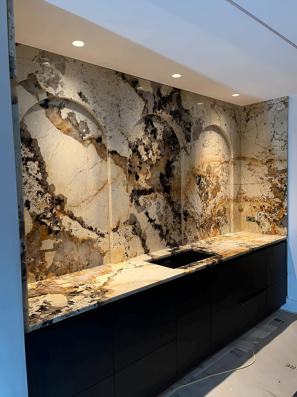A striking Patagonia Quartzite kitchen, known for its bold crystalline patterns and natural contrast.