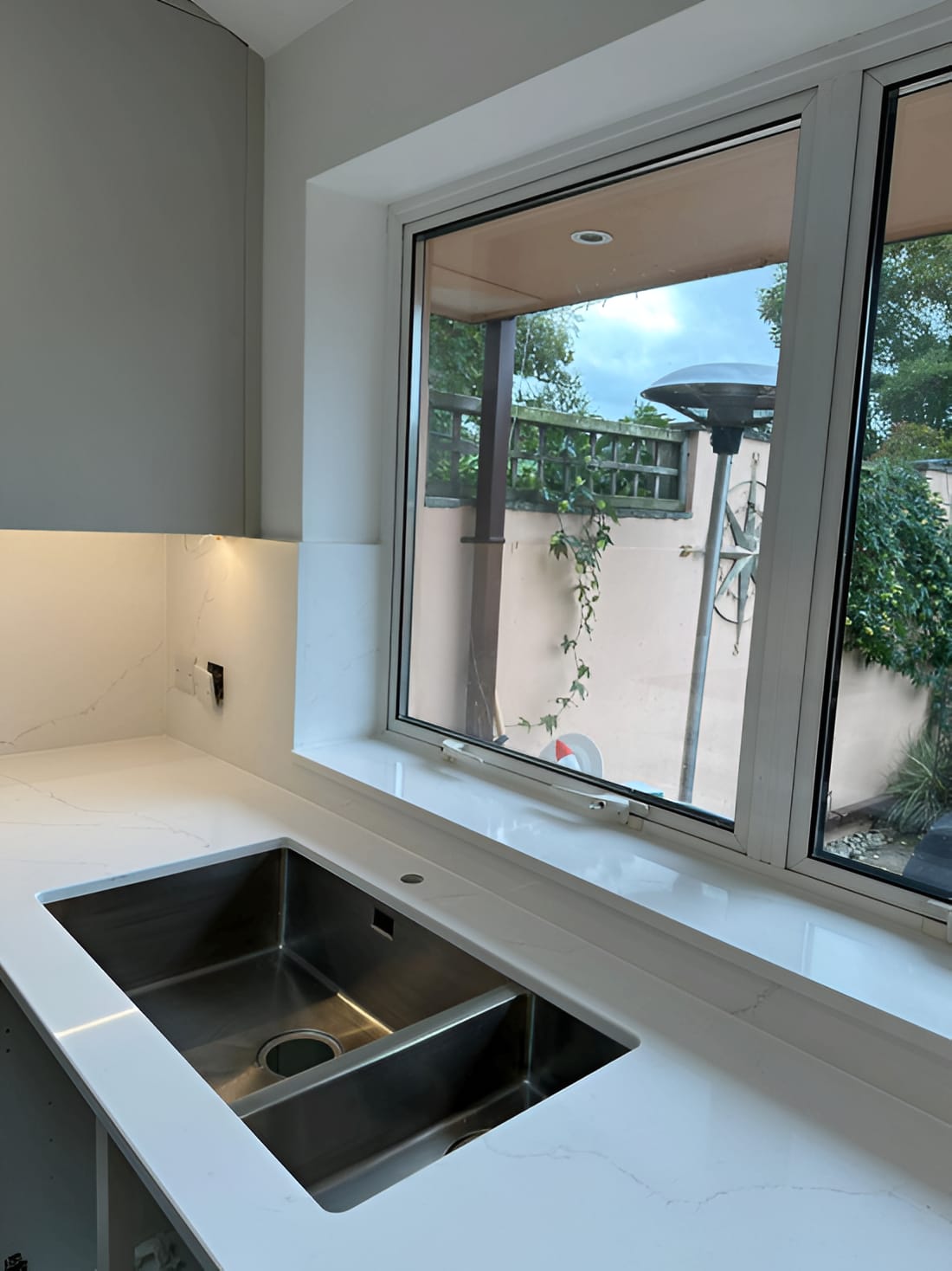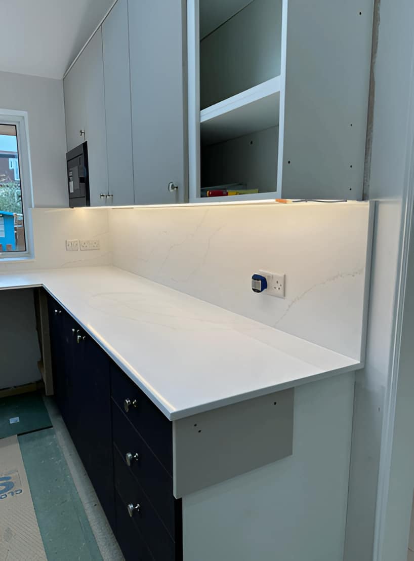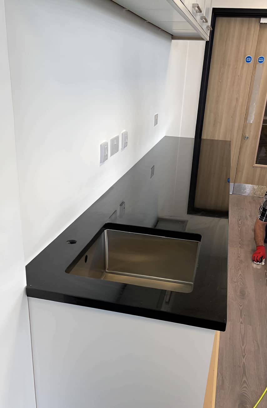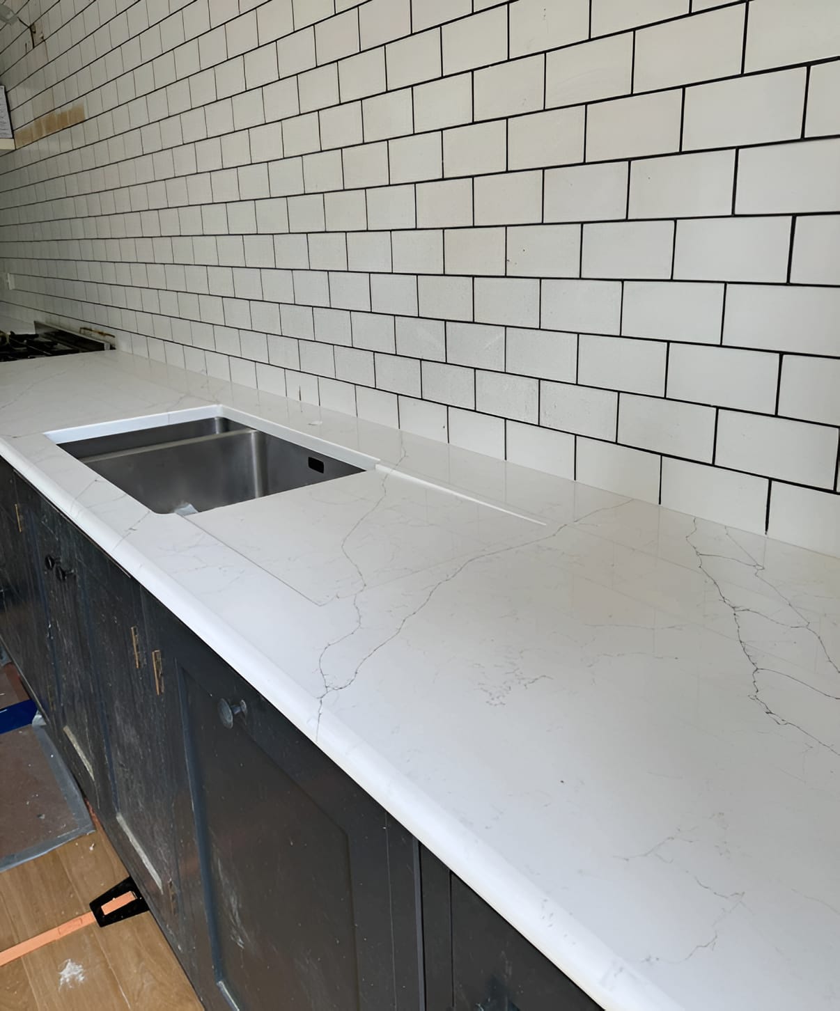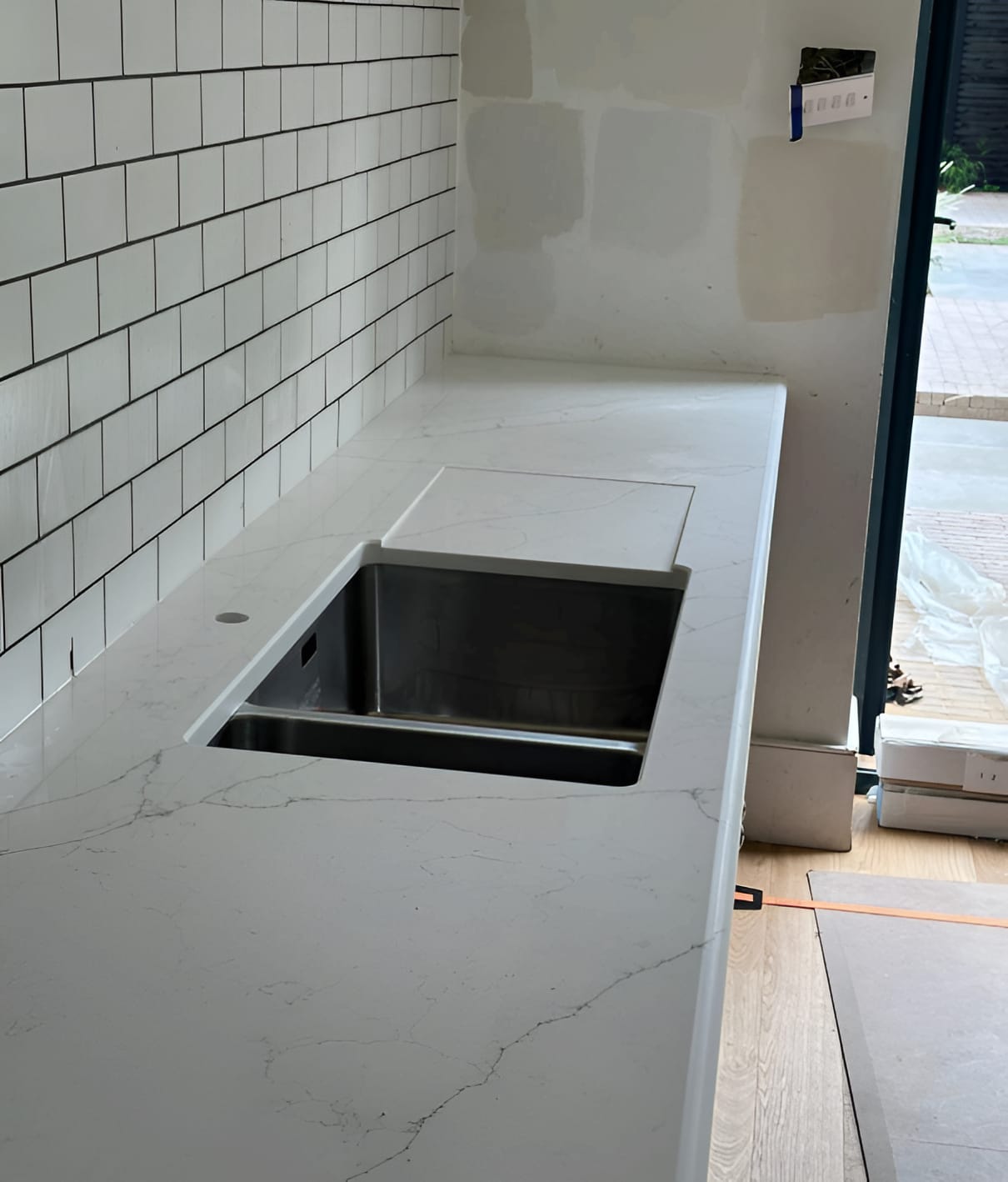The installation included full-height splashbacks, drainer grooves, and upstands, along with all required cut-outs.