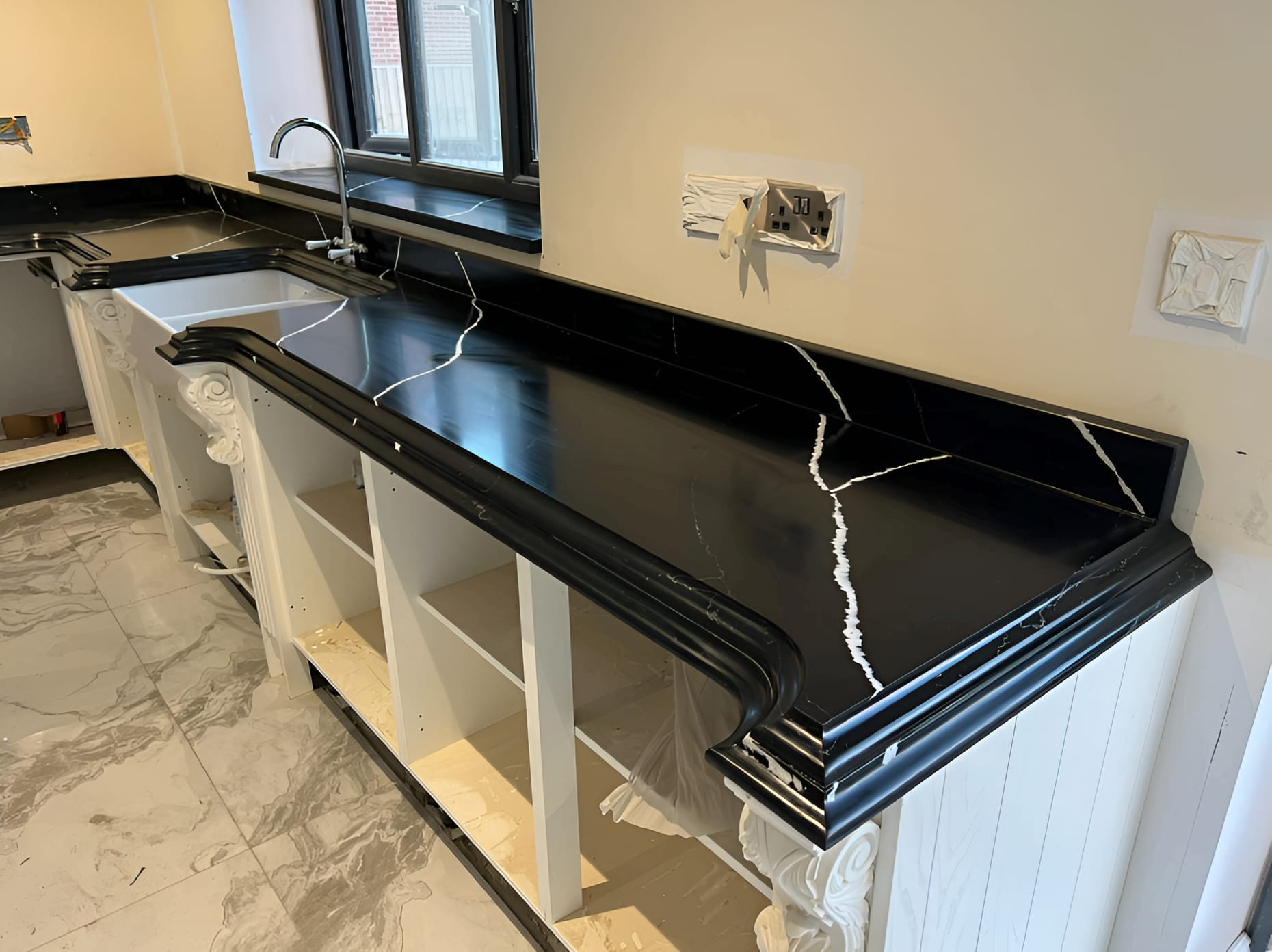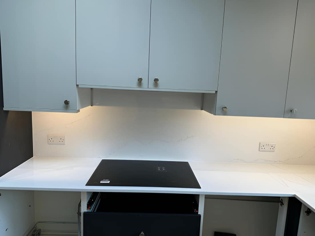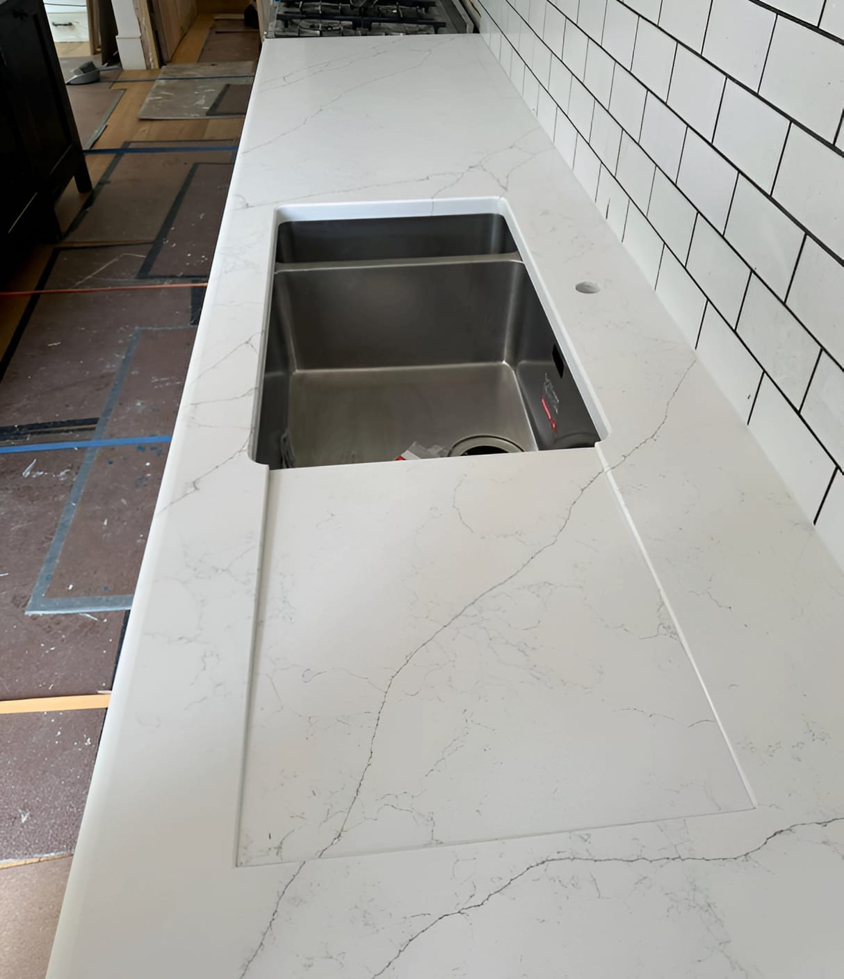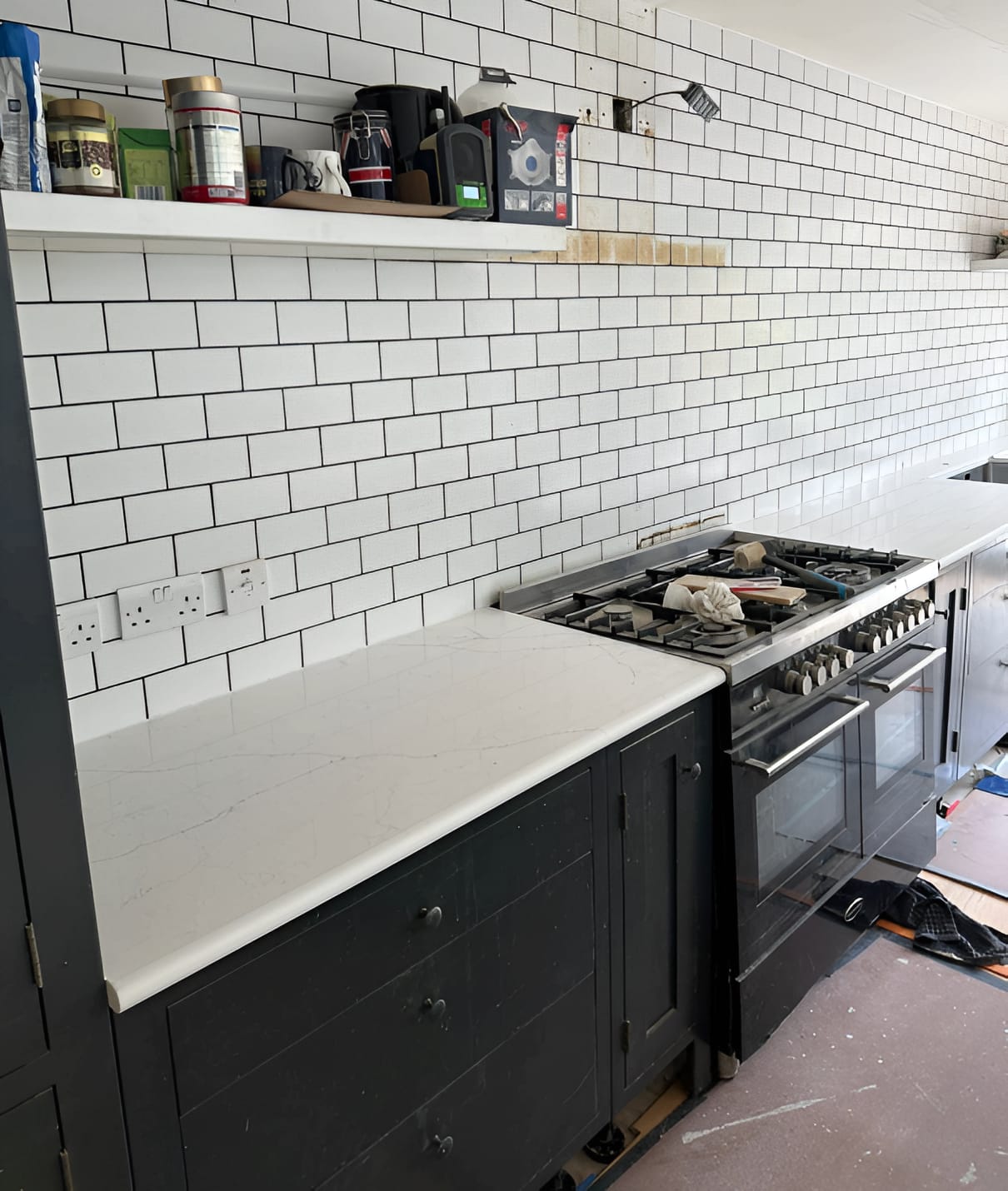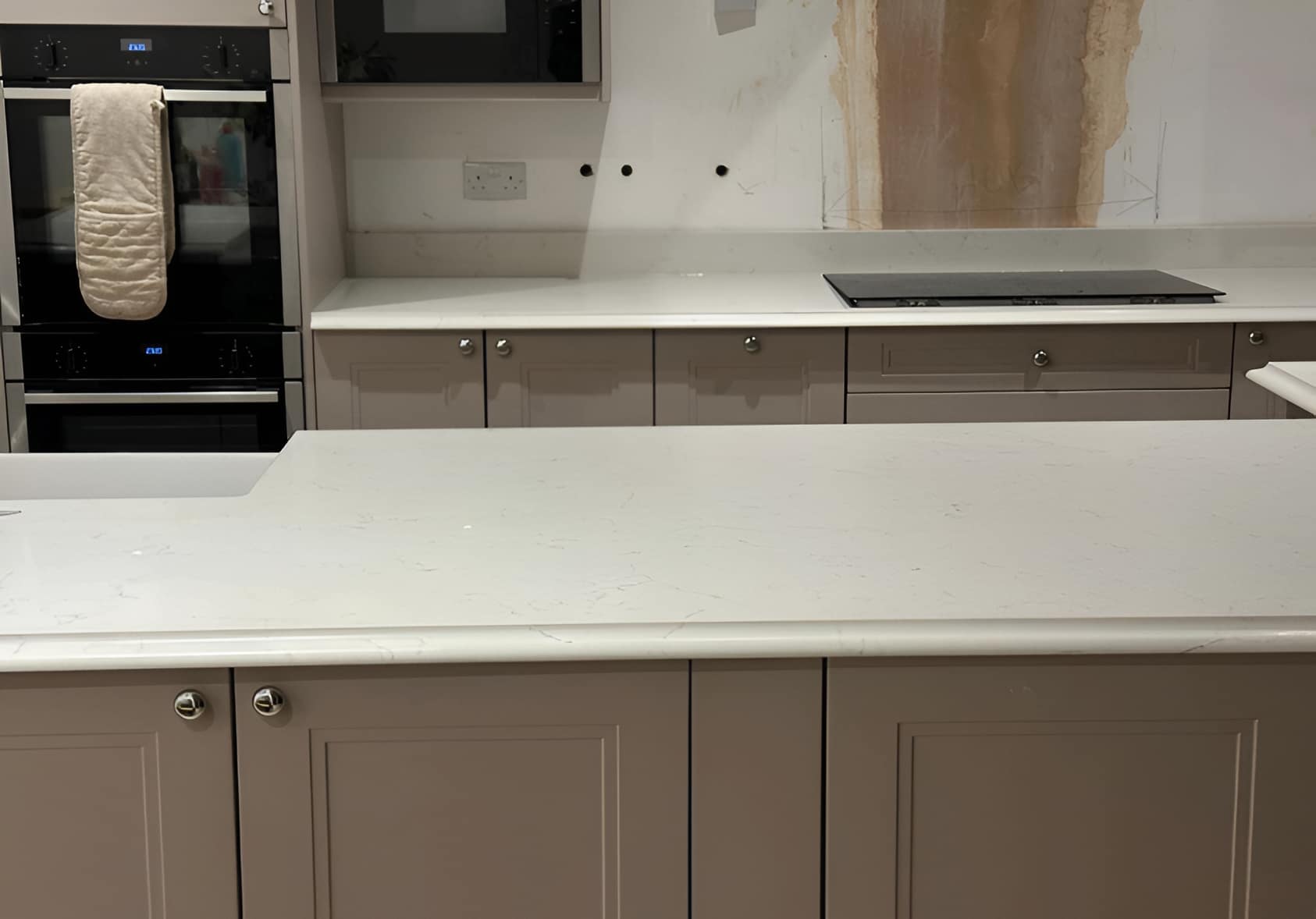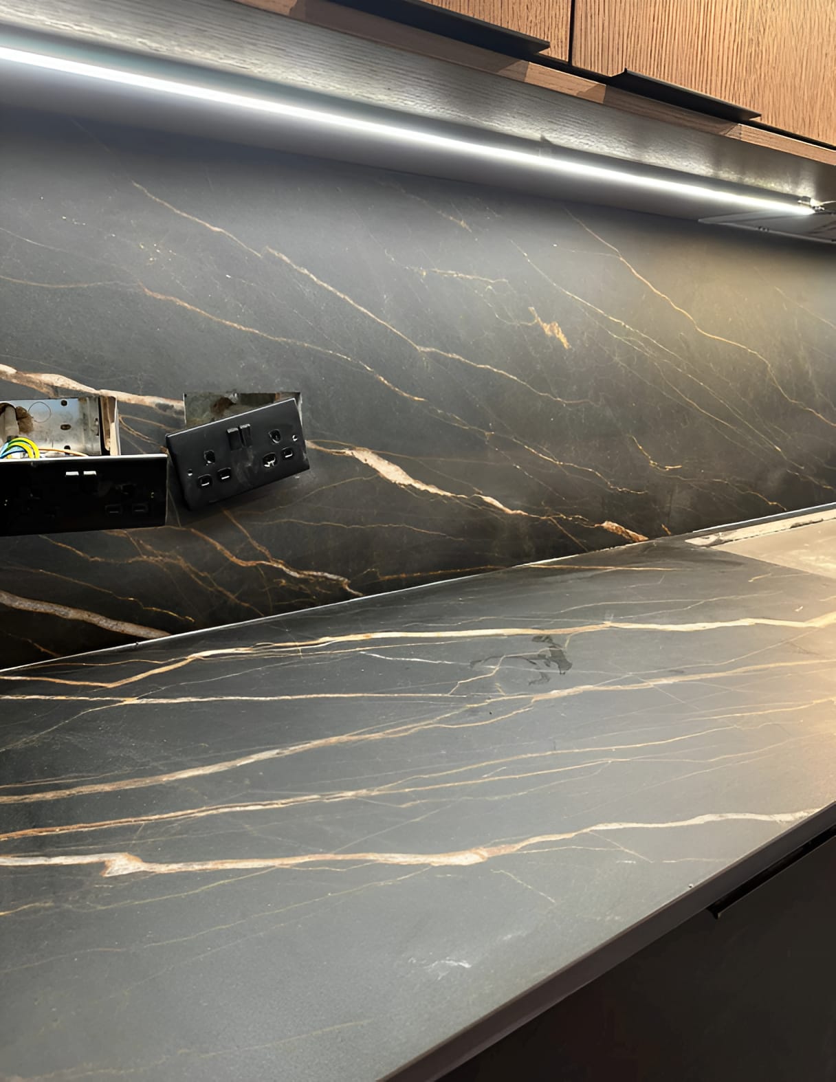 The installation included full-height splashbacks, drainer grooves, and upstands, along with all required cut-outs.