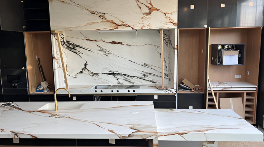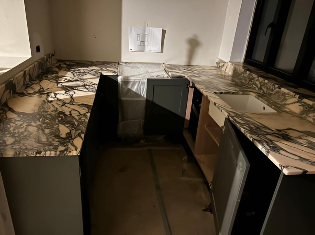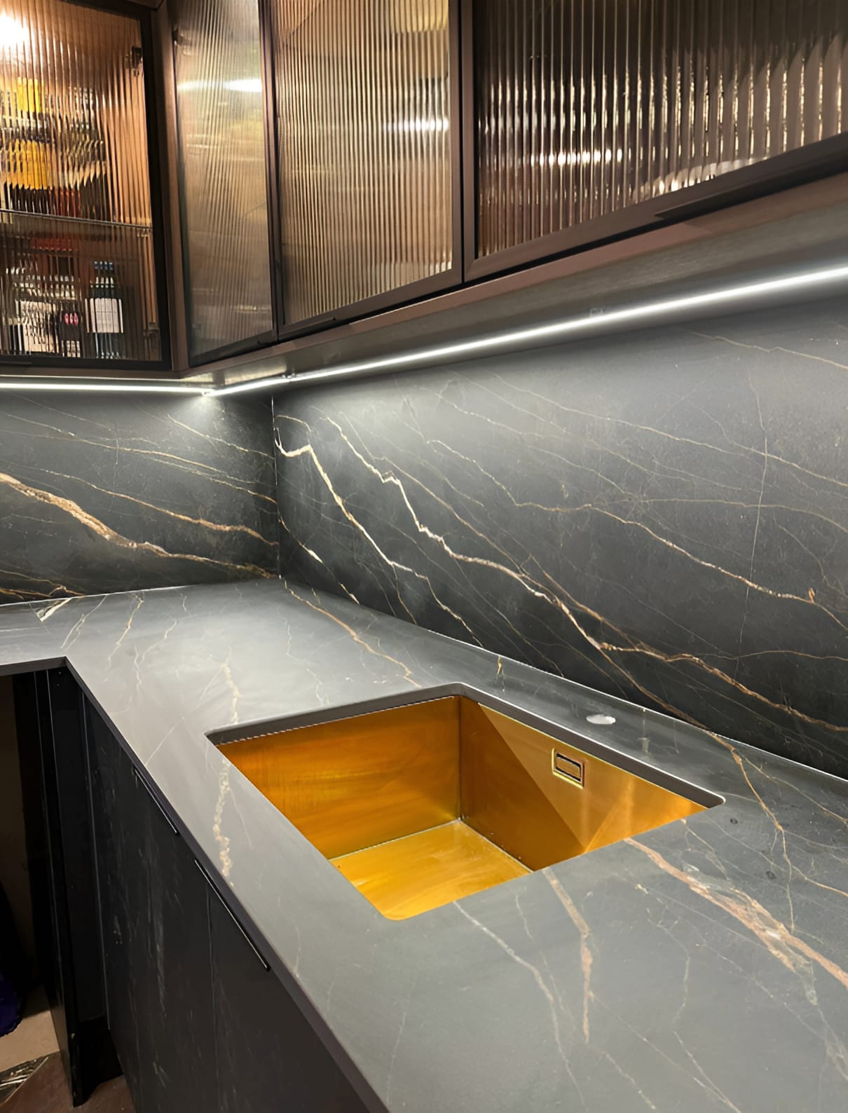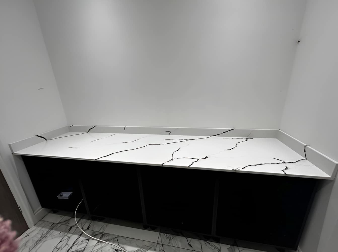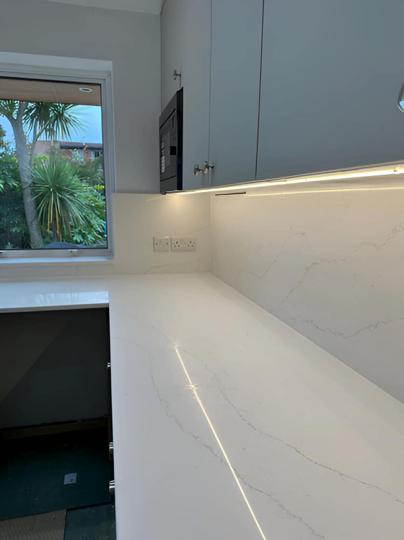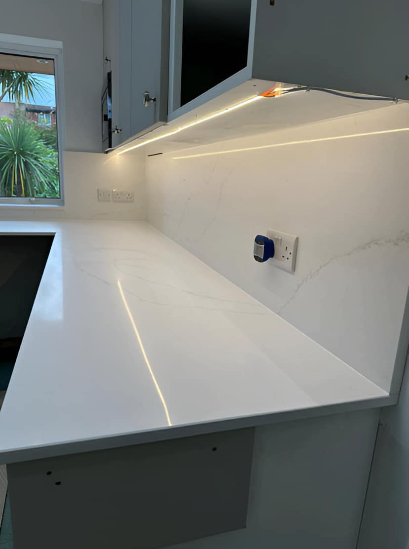 The installation included full-height splashbacks, drainer grooves, and upstands, along with all required cut-outs.