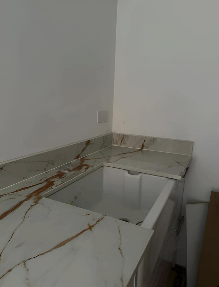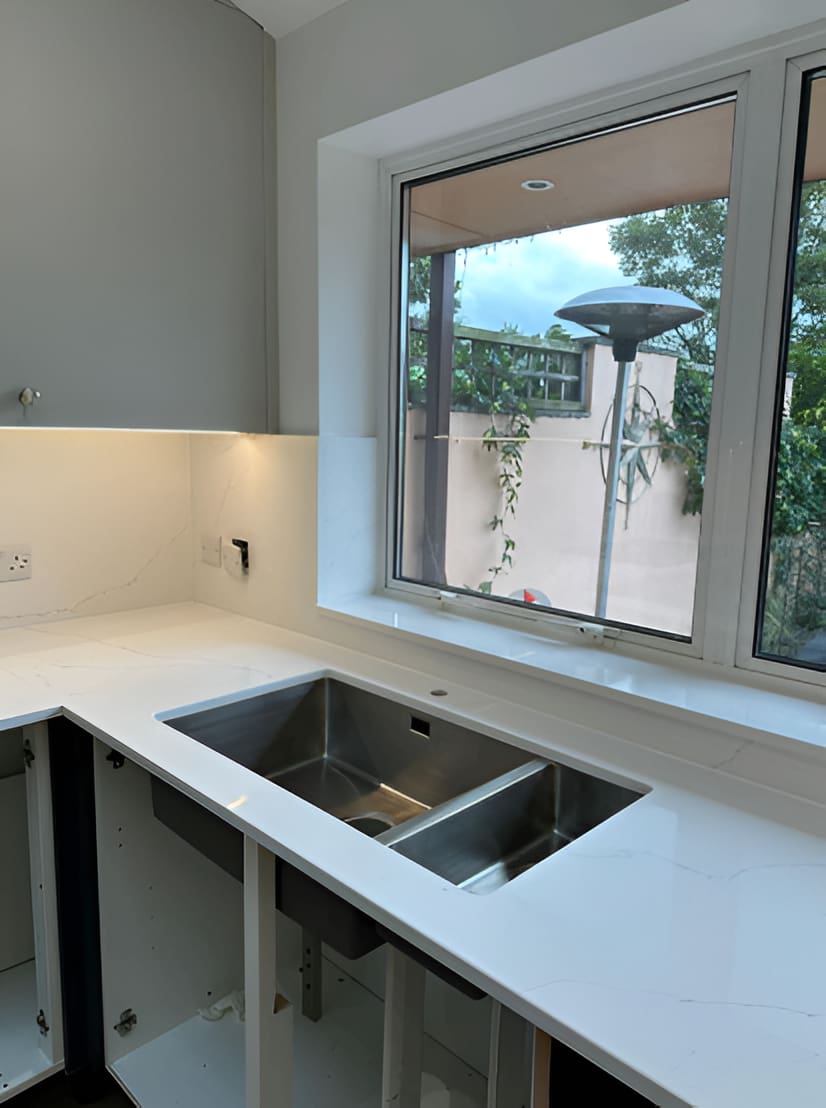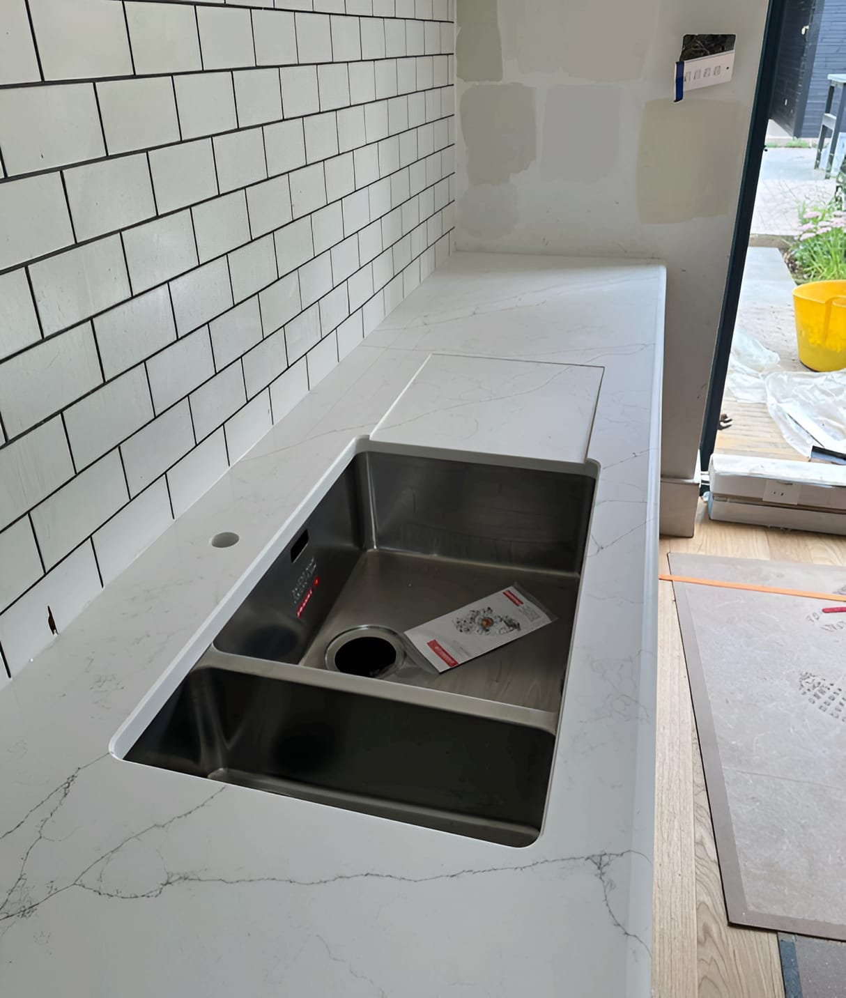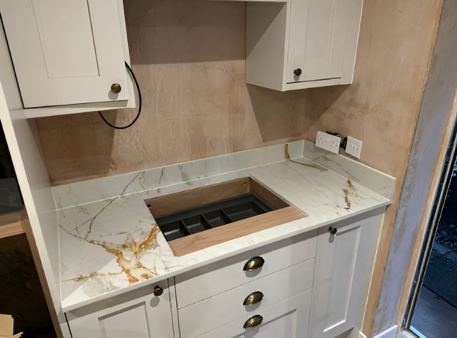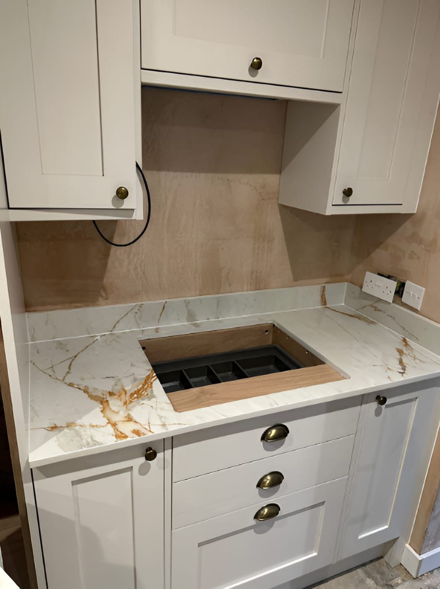 Precision cut-outs for sink, tap, and hob were completed, maintaining a seamless finish throughout.