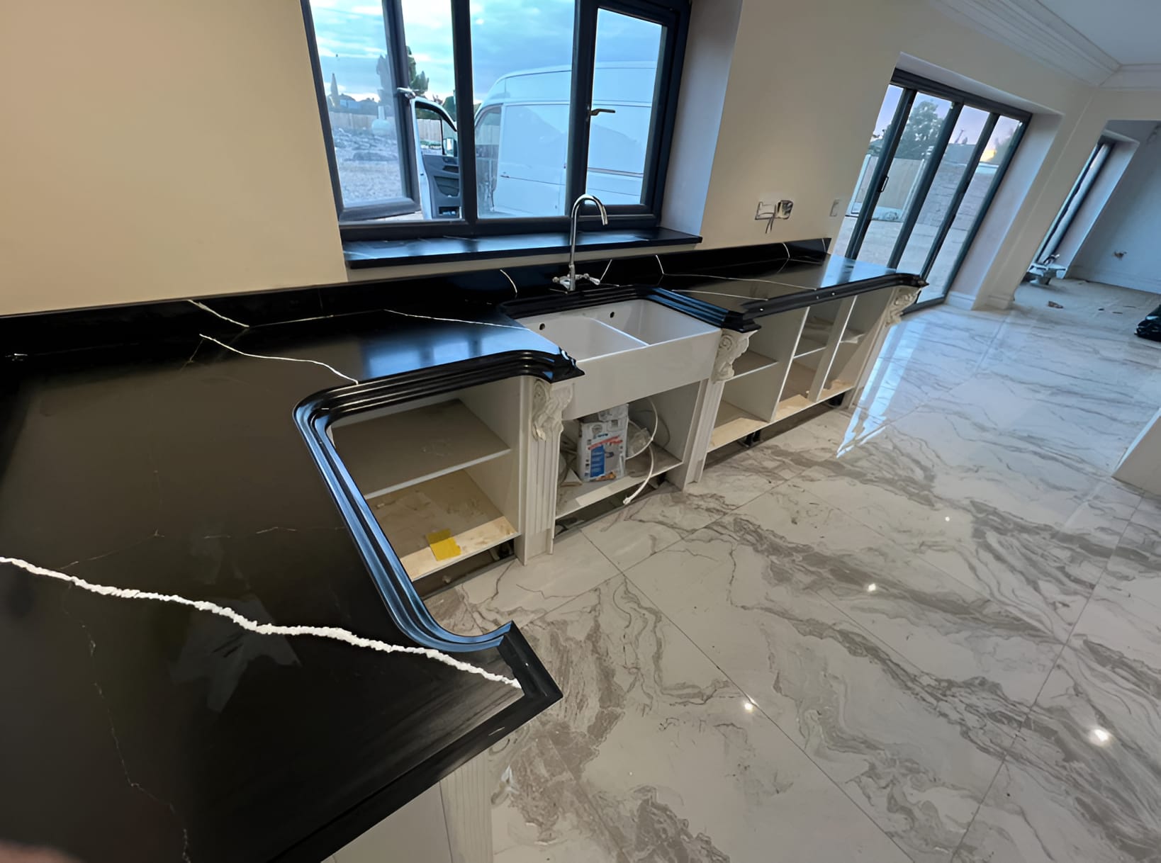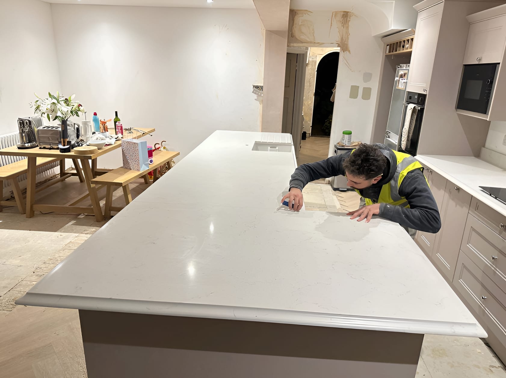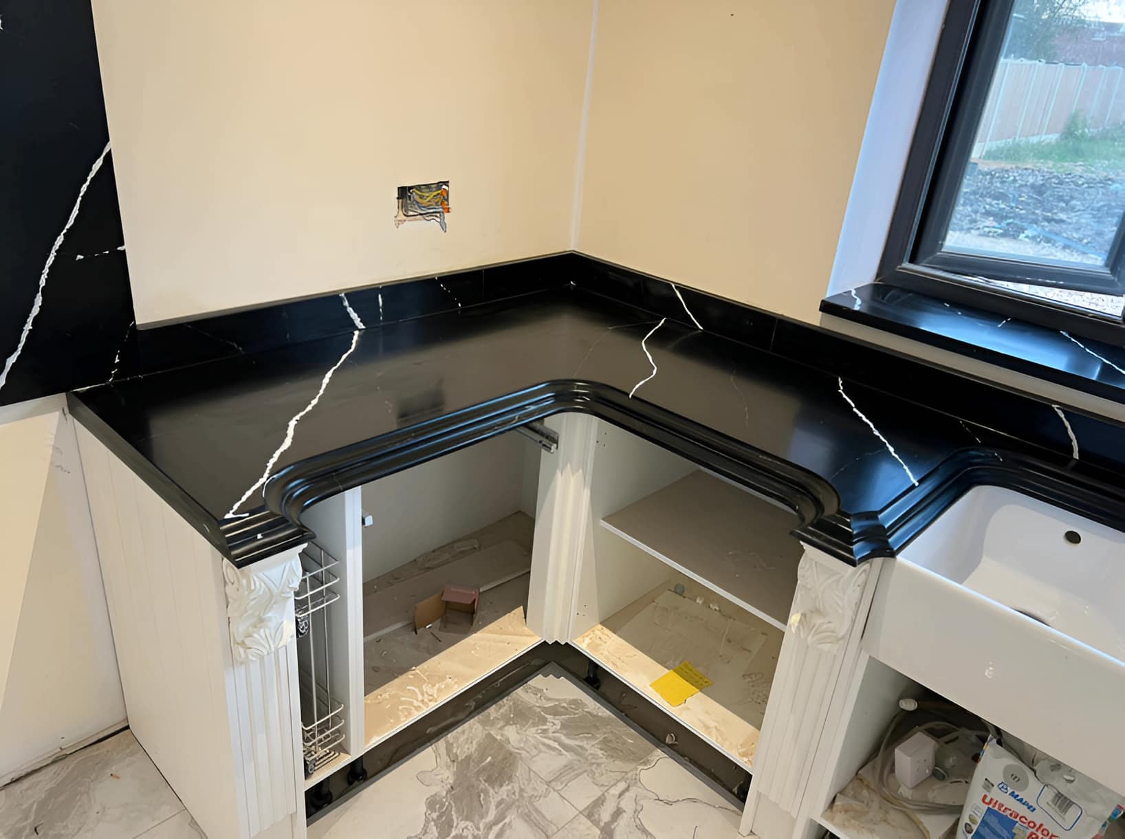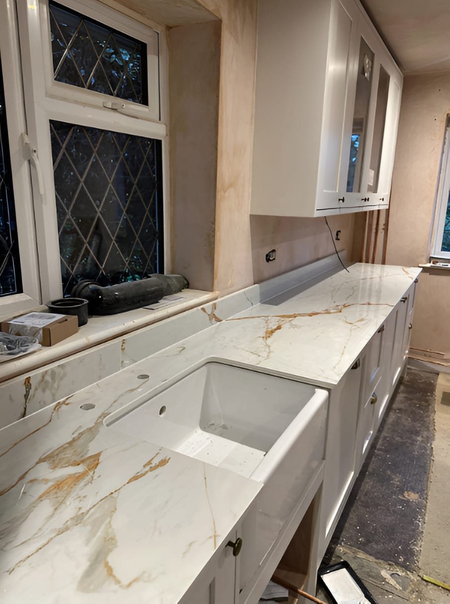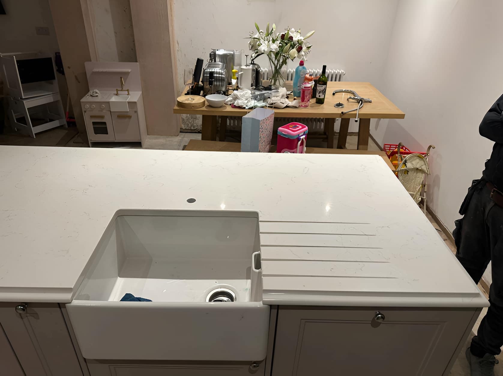 Precision cut-outs for sink, tap, and hob were completed, maintaining a seamless finish throughout.