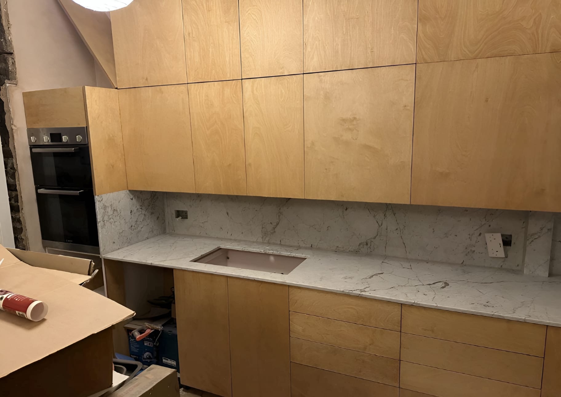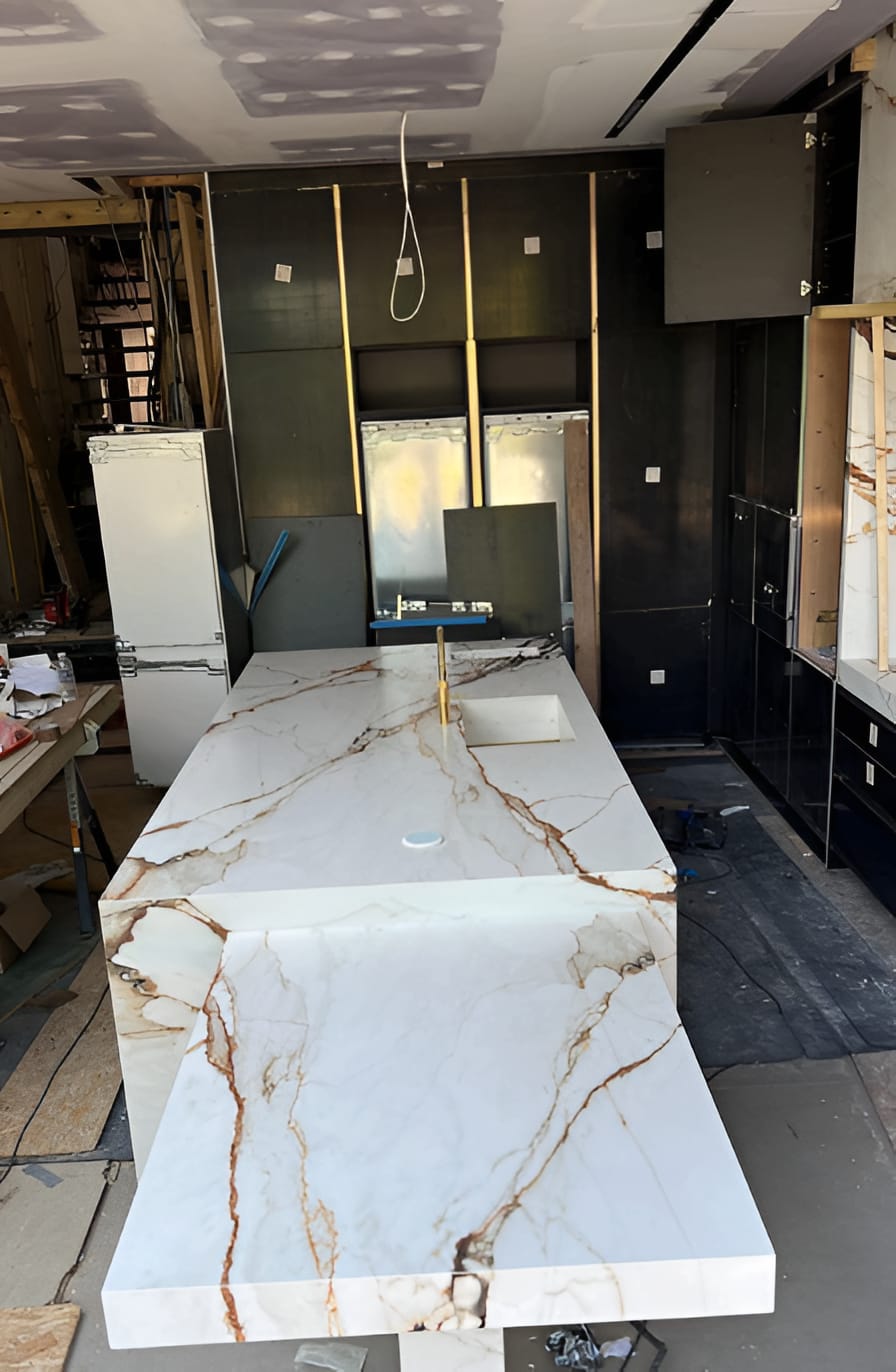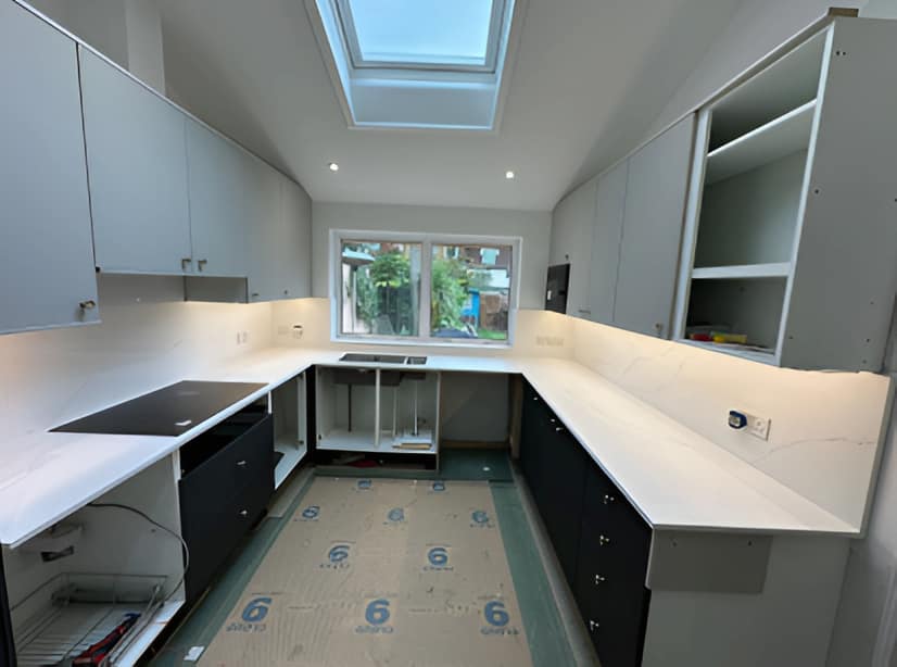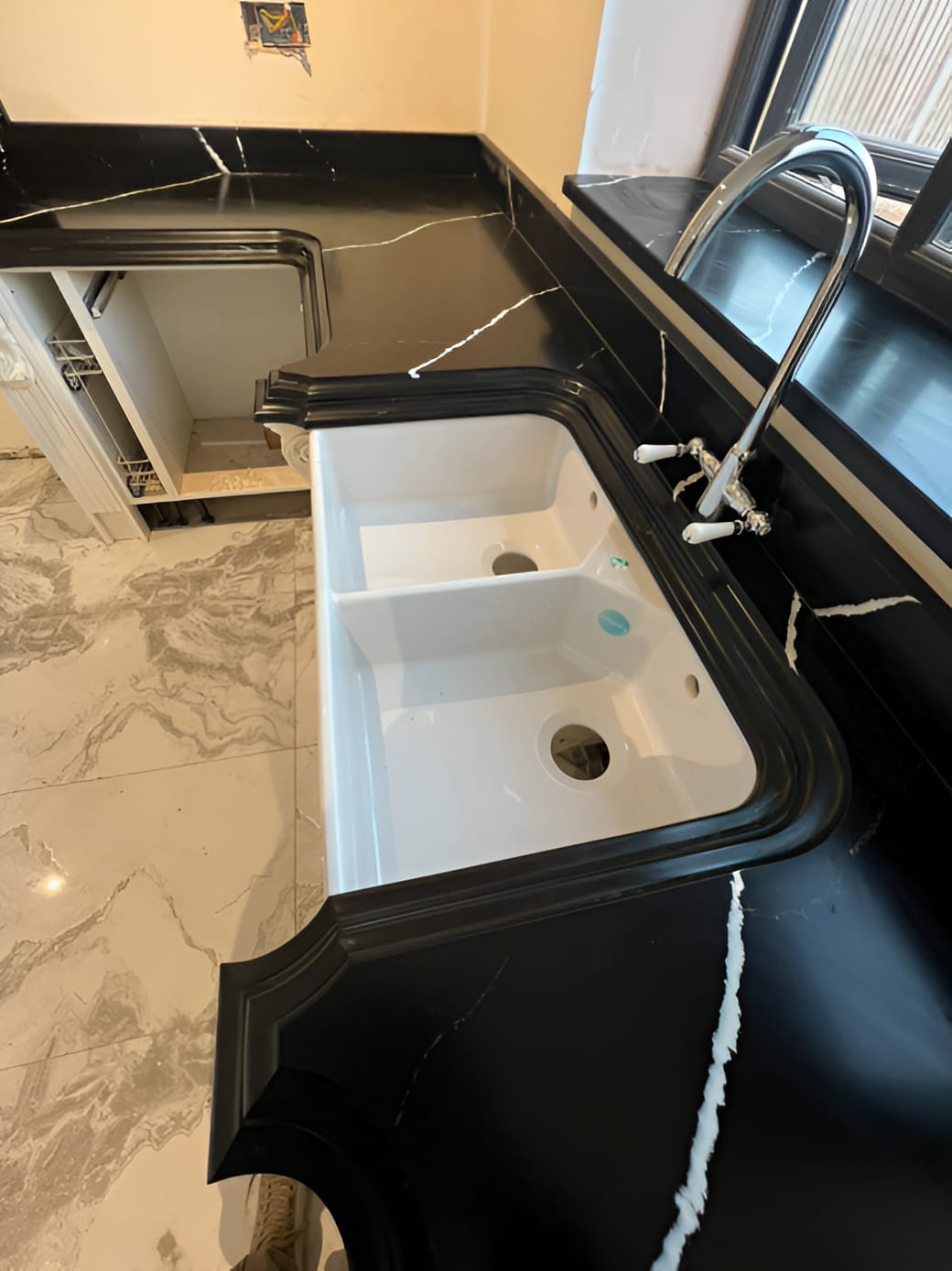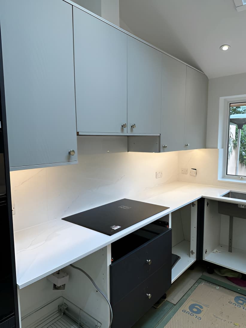Precision cut-outs for sink, tap, and hob were completed, maintaining a seamless finish throughout.