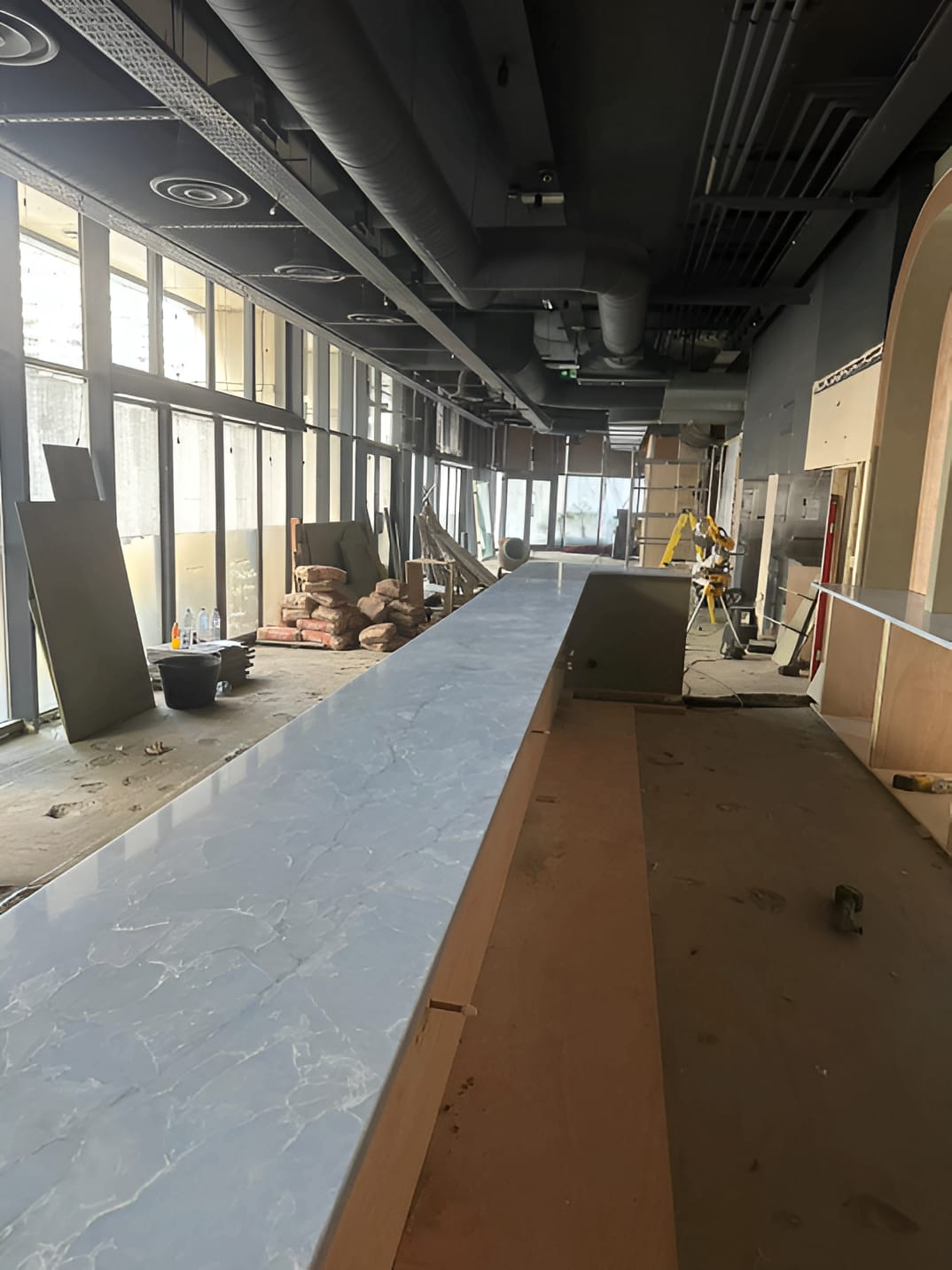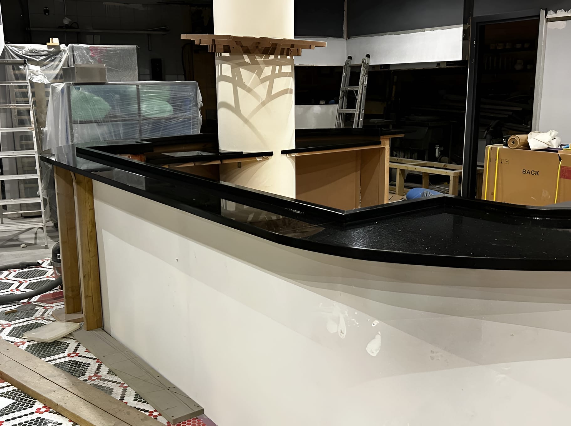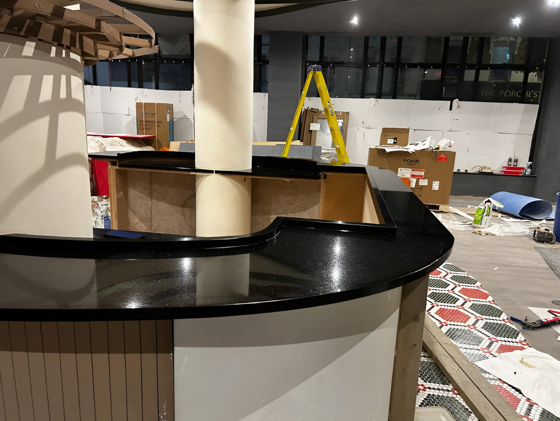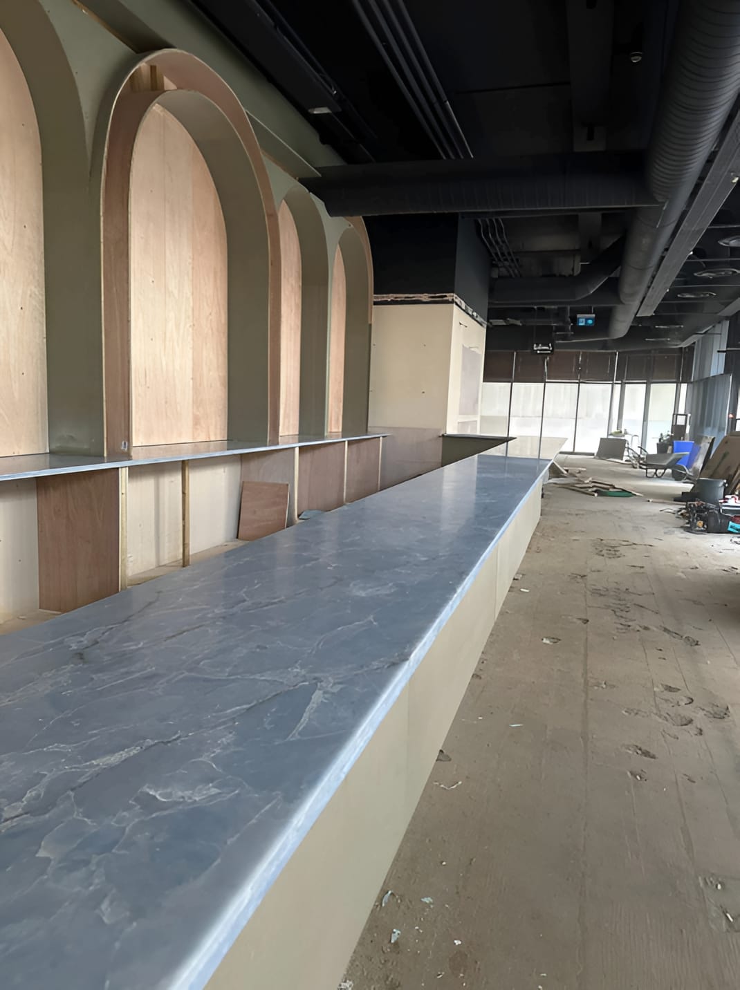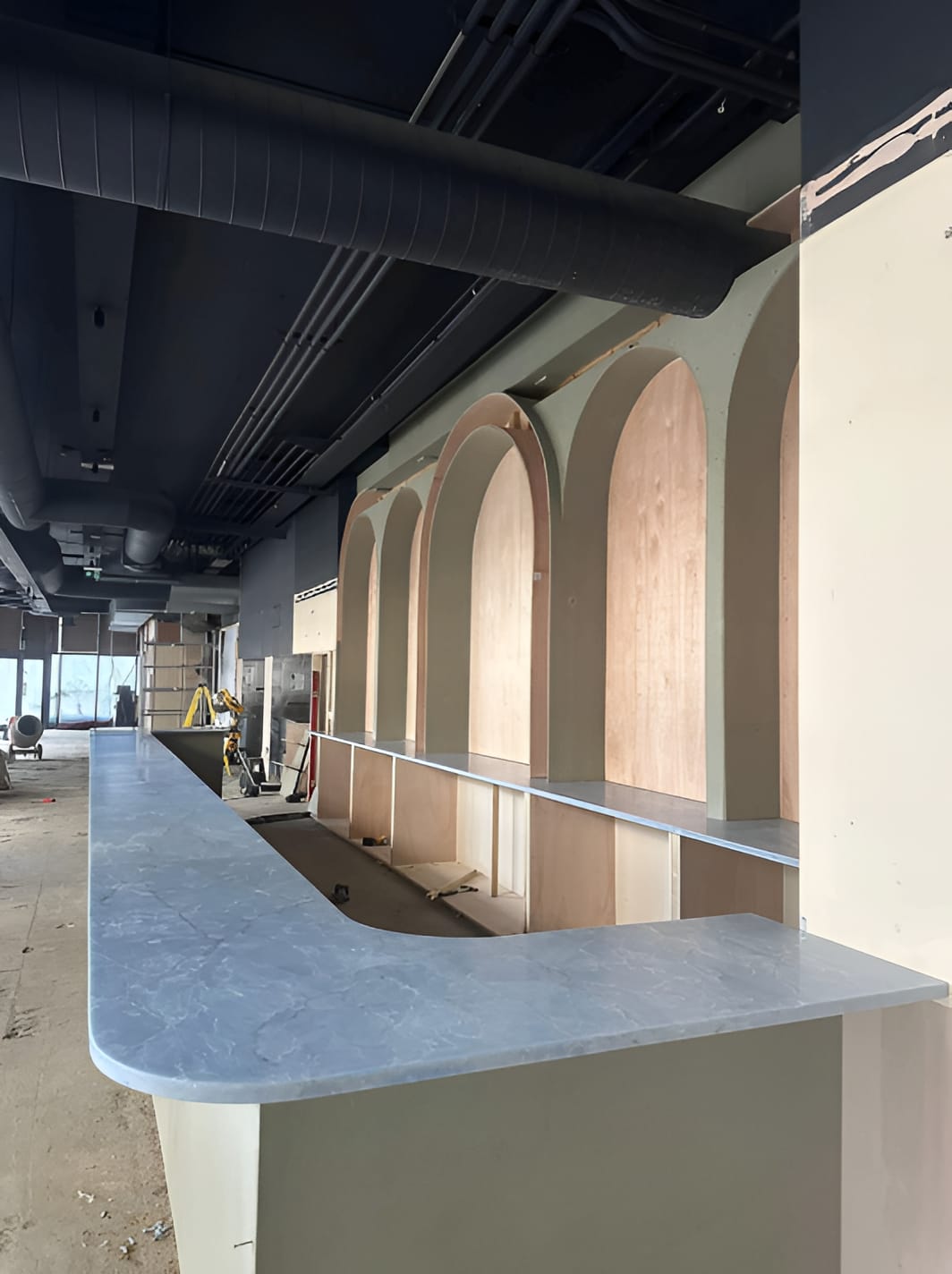 The project included fabrication and installation of two custom rounded bar tops, designed to flow seamlessly around structural columns.