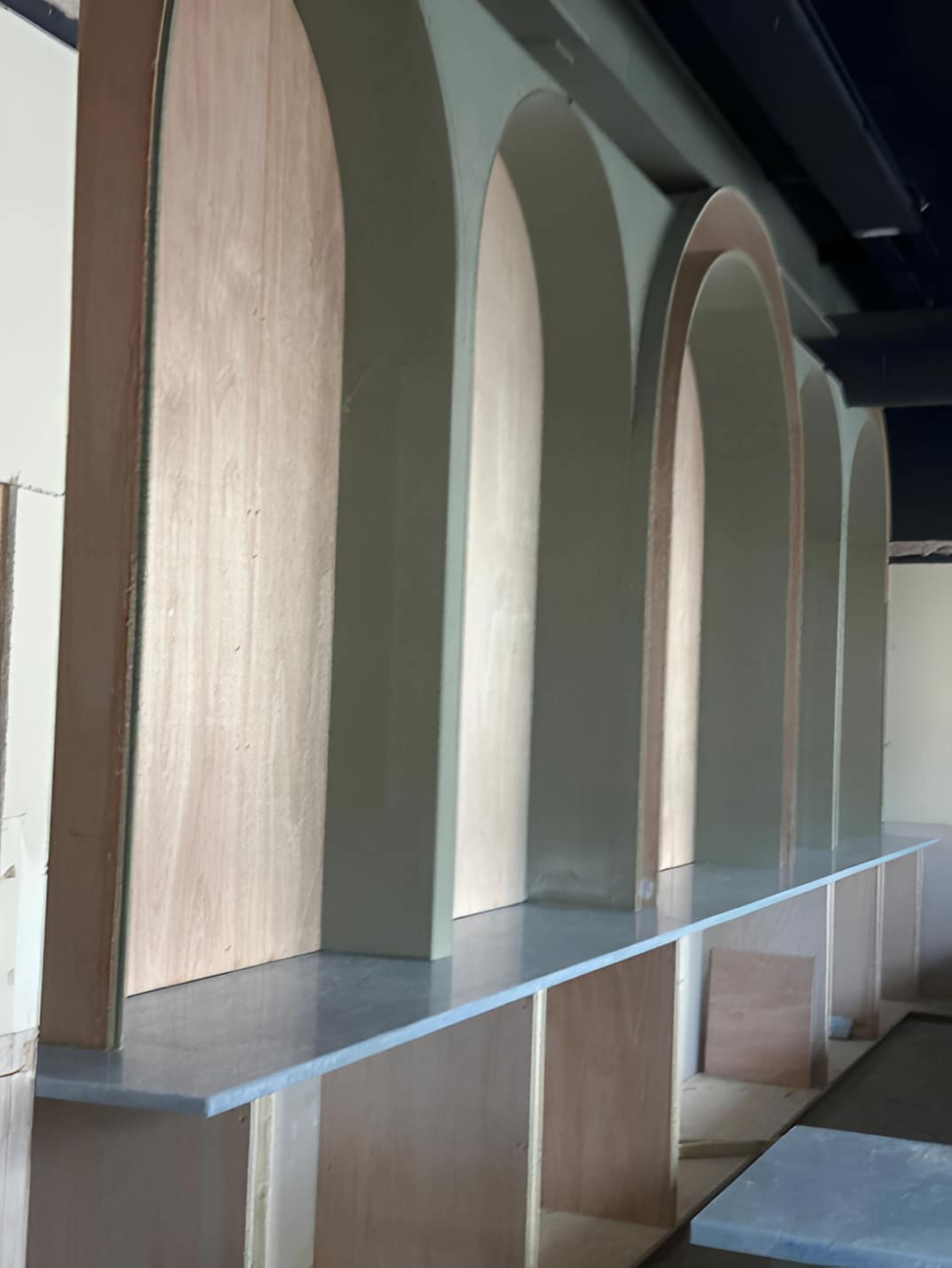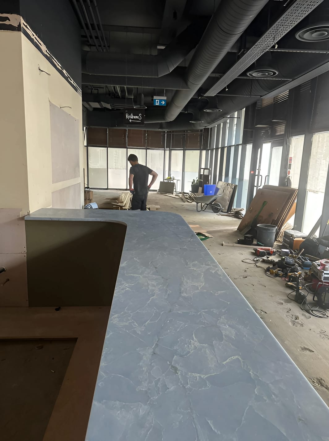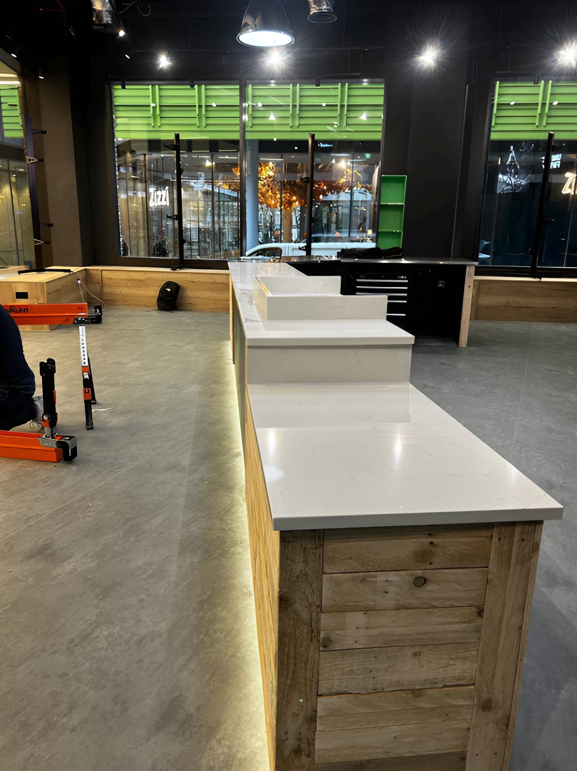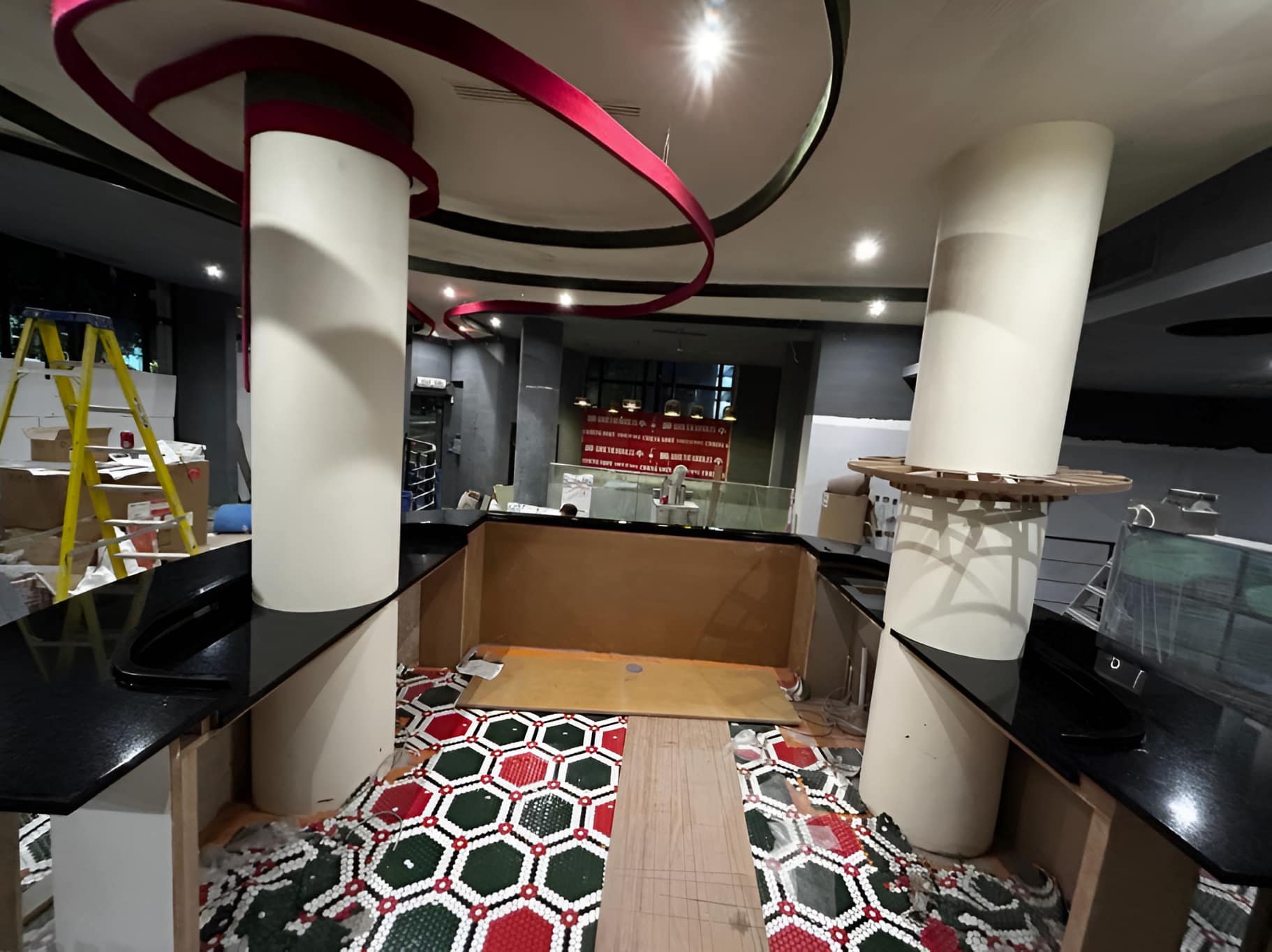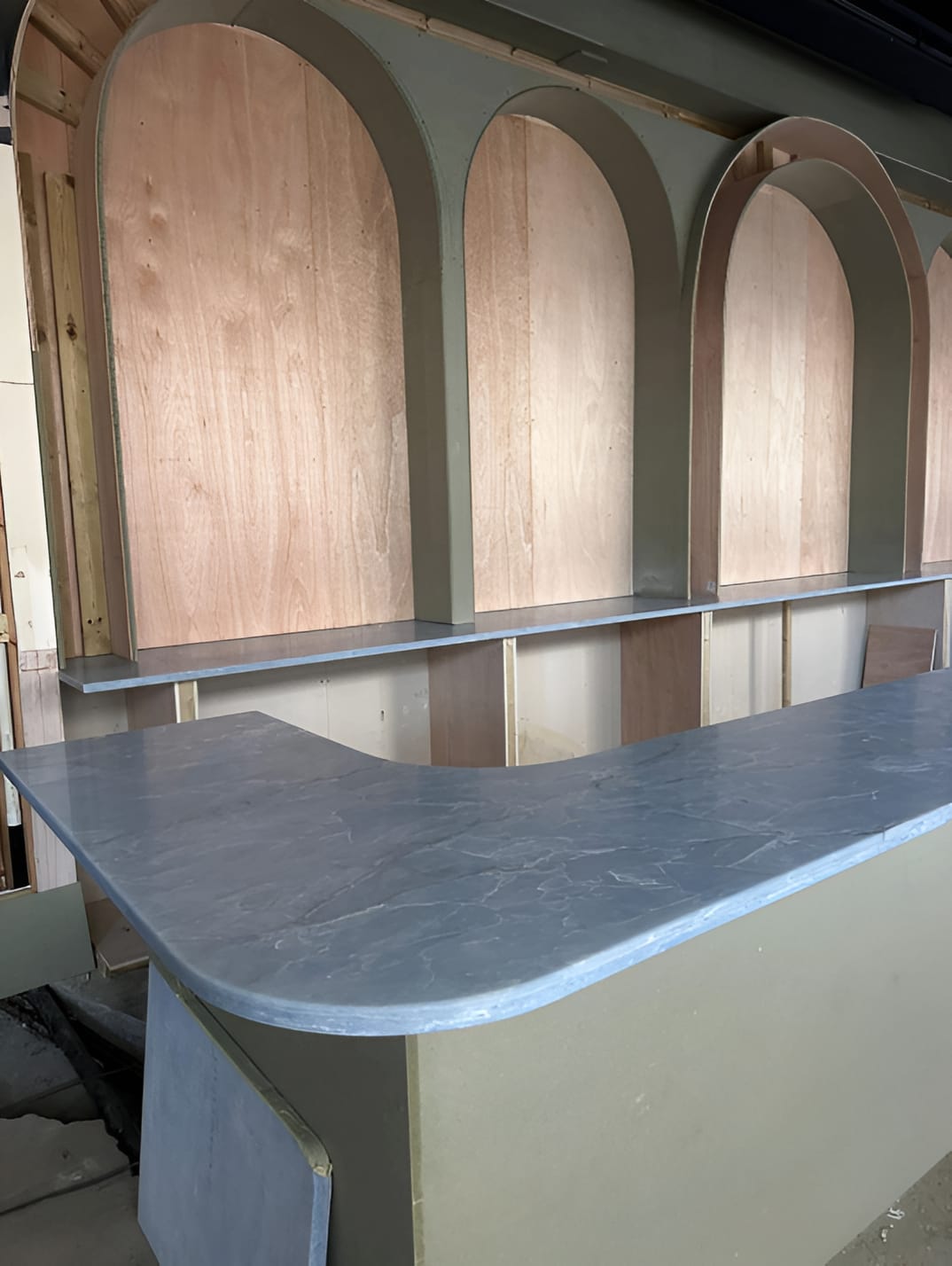 The project included fabrication and installation of two custom rounded bar tops, designed to flow seamlessly around structural columns.