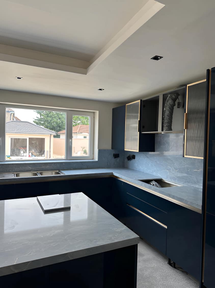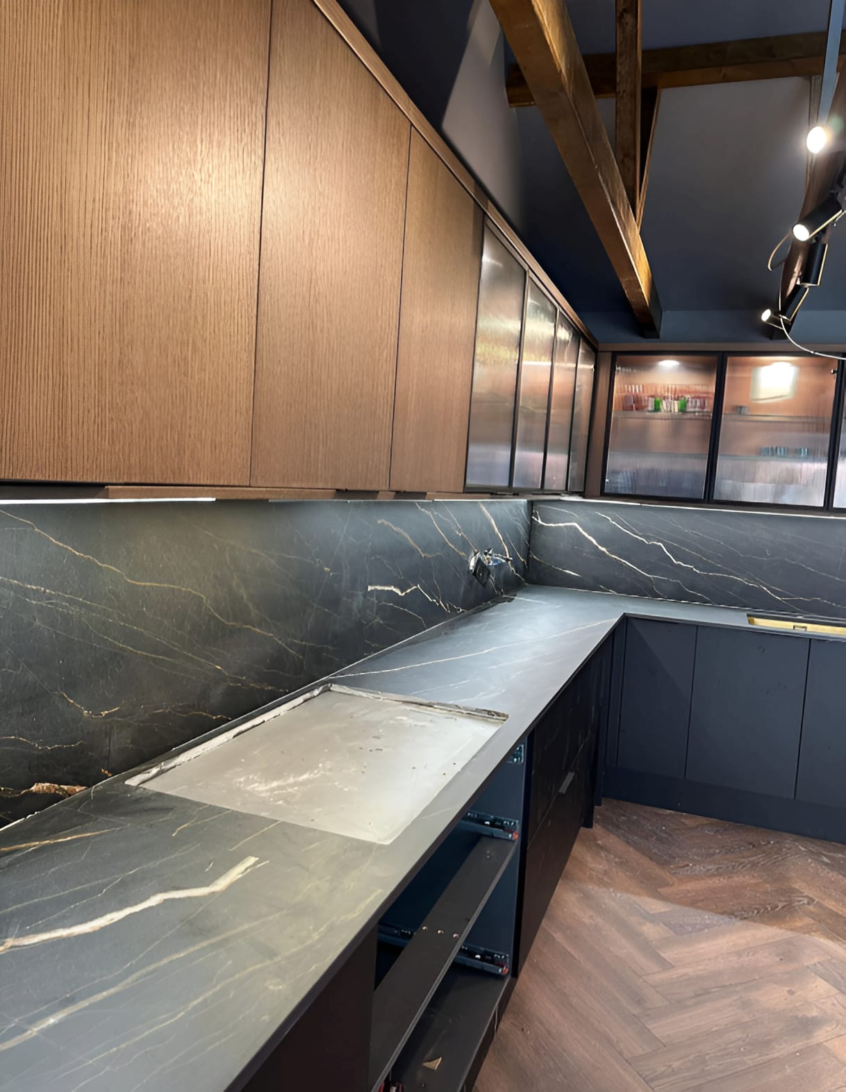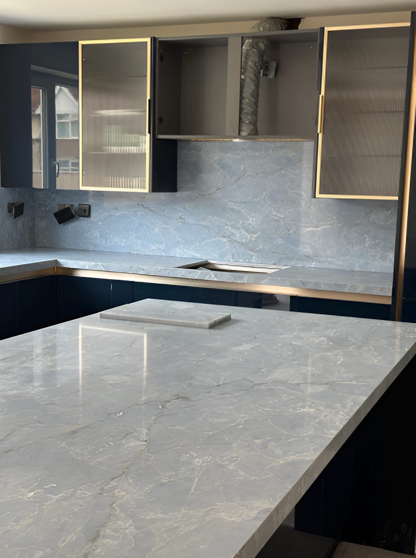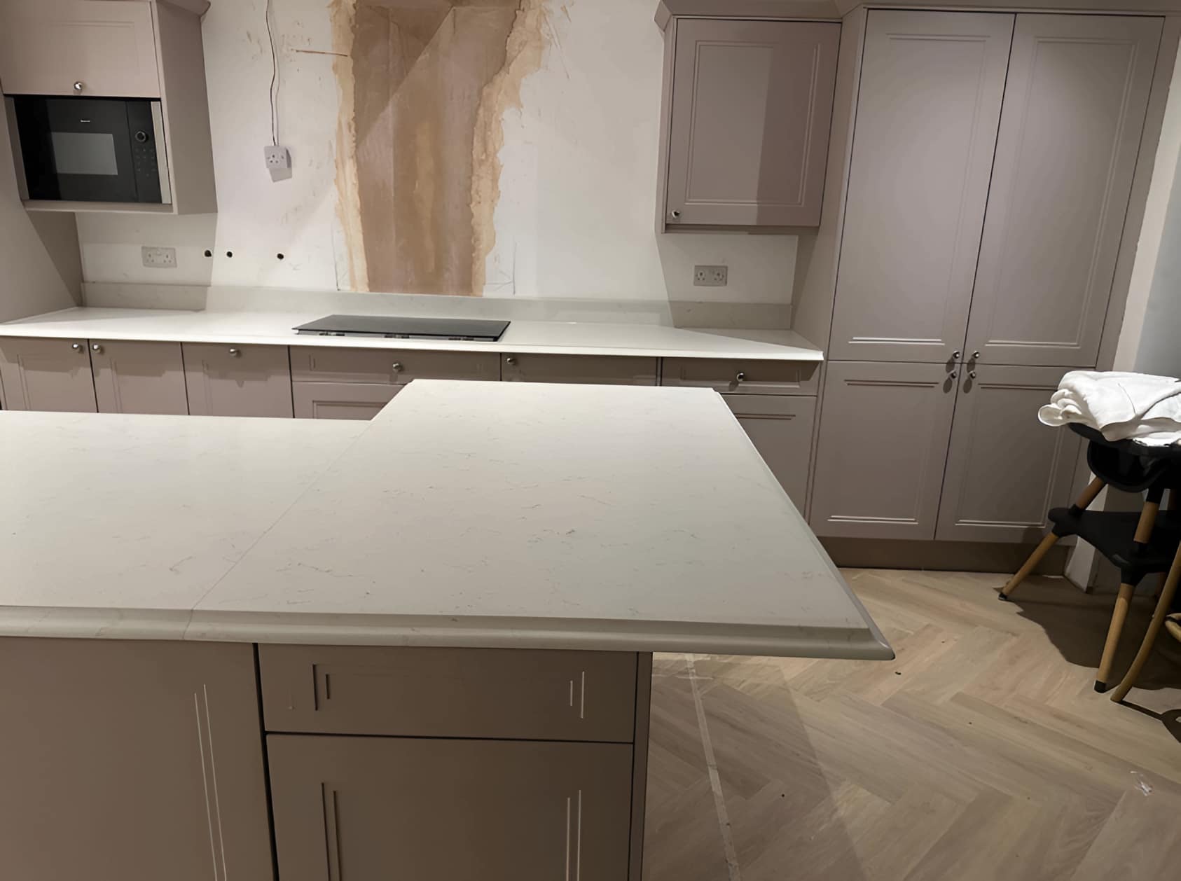 The project involved full supply, templating, and installation of worktops and splashbacks, with a double-edge profile to achieve a thicker visual finish.
