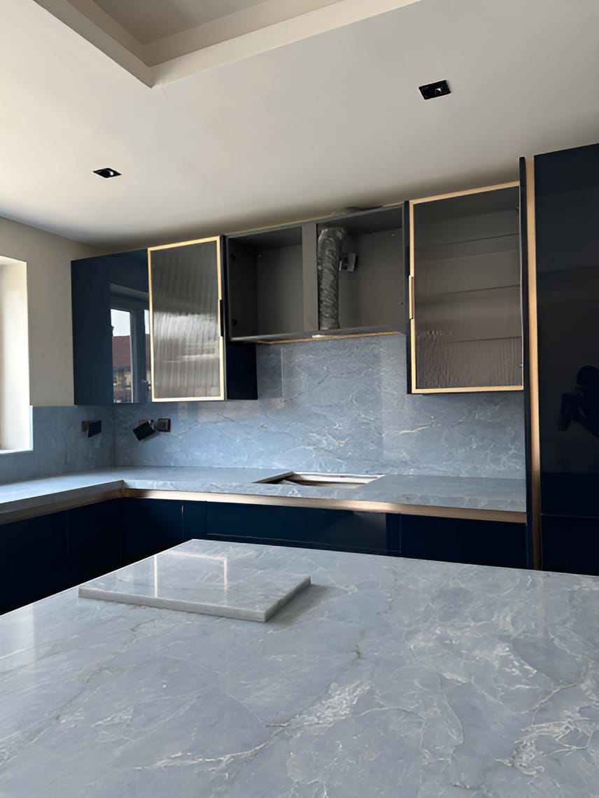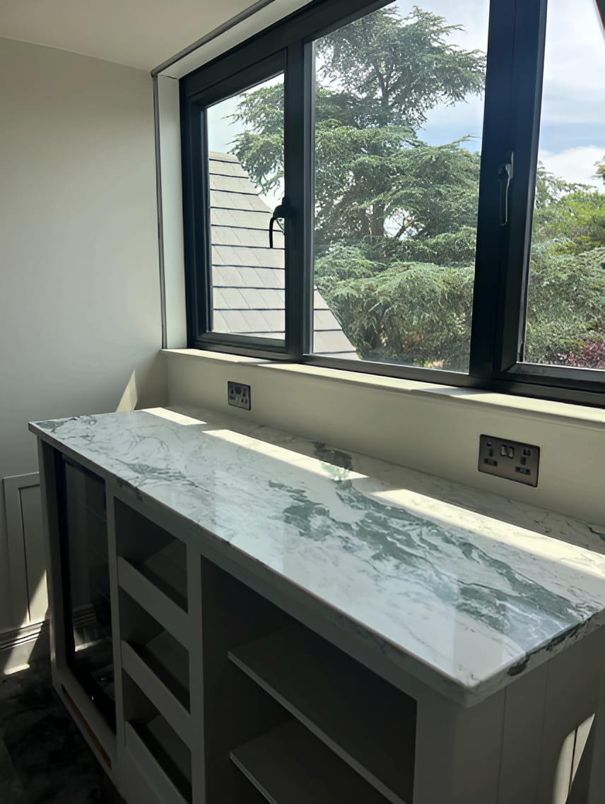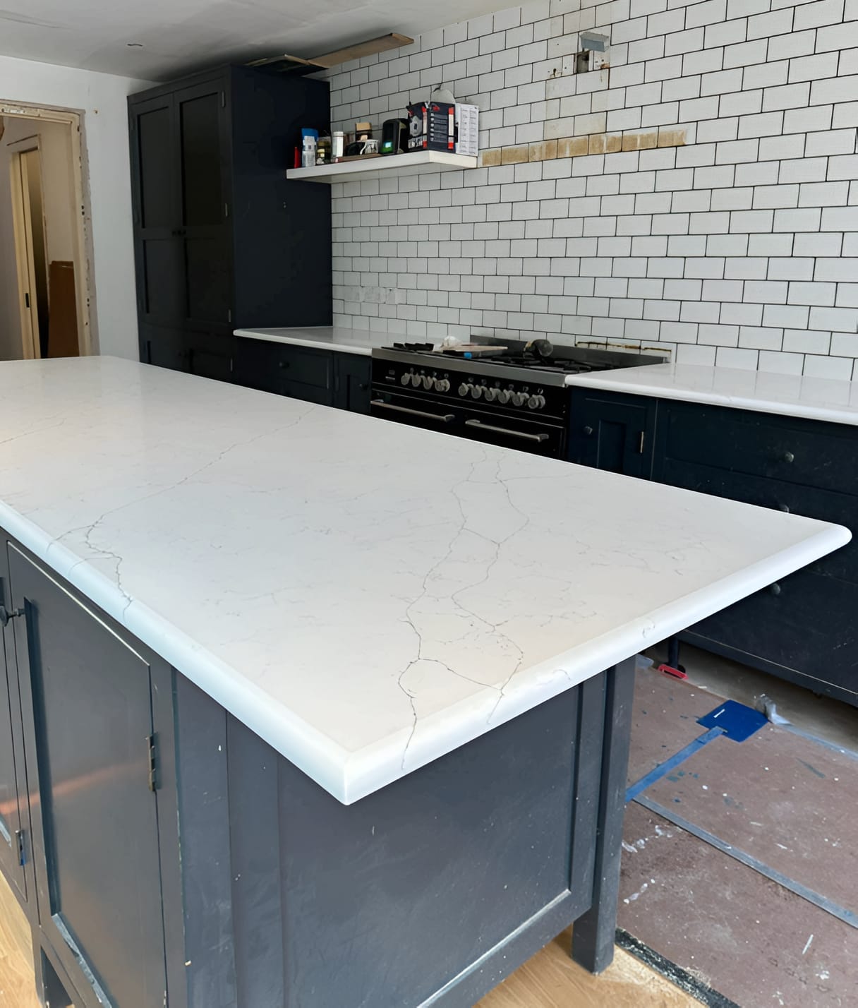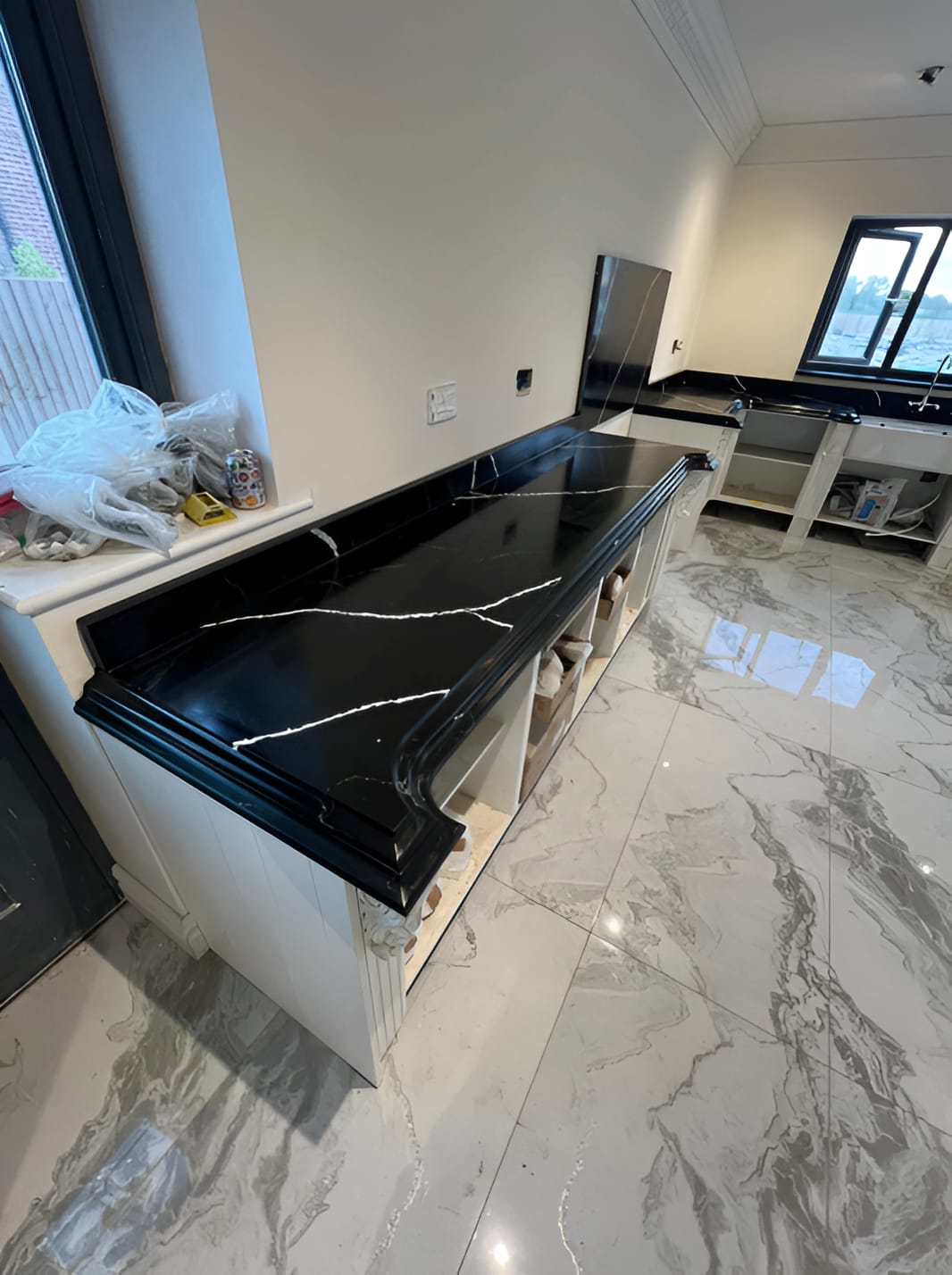 The project involved full supply, templating, and installation of worktops and splashbacks, with a double-edge profile to achieve a thicker visual finish.