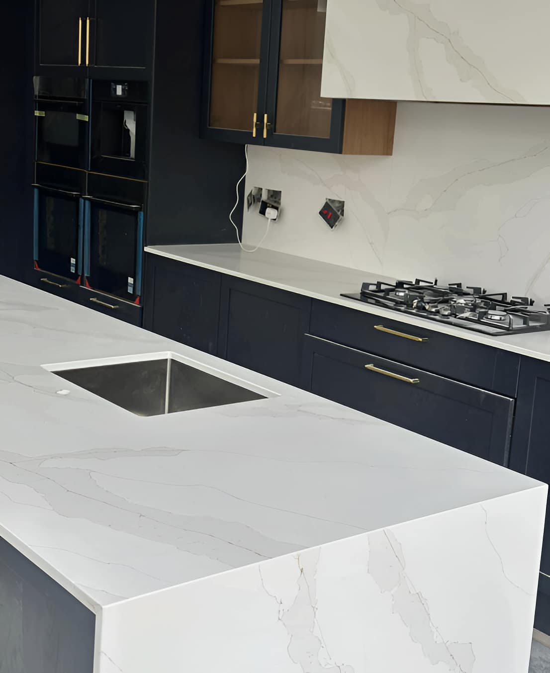 A contemporary kitchen finished in Calacatta-style white quartz, offering a bright and minimal look.