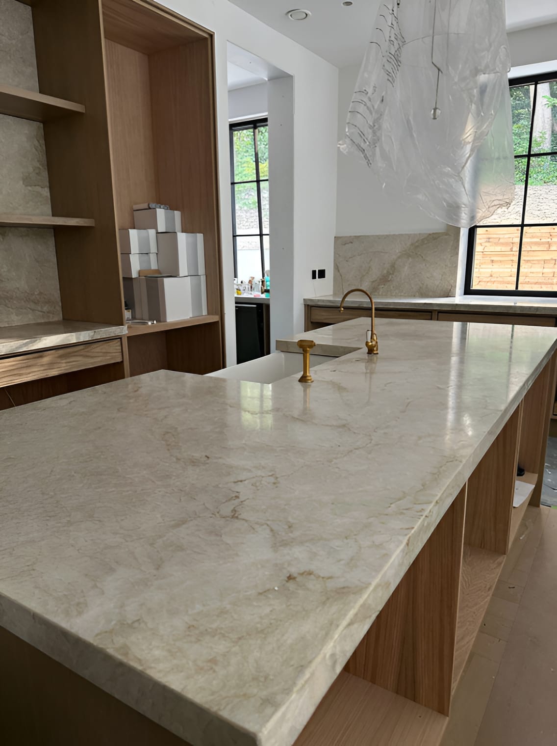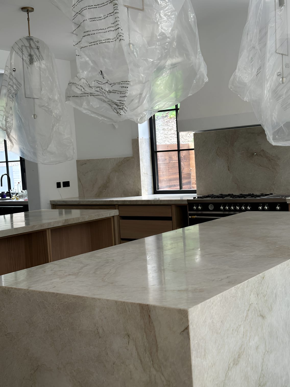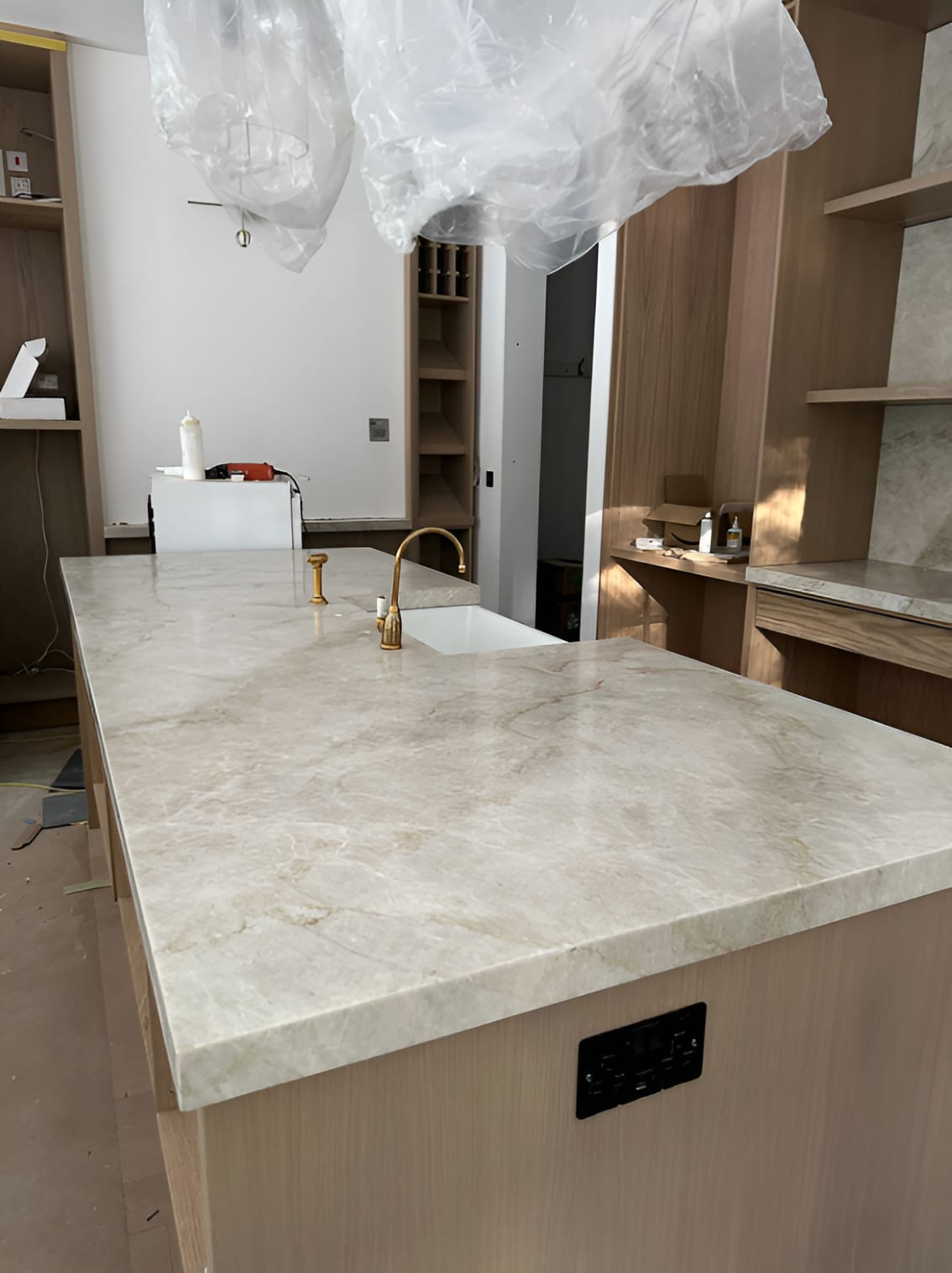 This project features a Taj Mahal Quartzite kitchen, selected for its warm cream tones and subtle veining, creating a soft and elegant finish throughout the space.