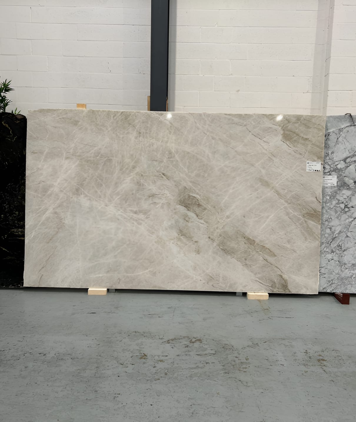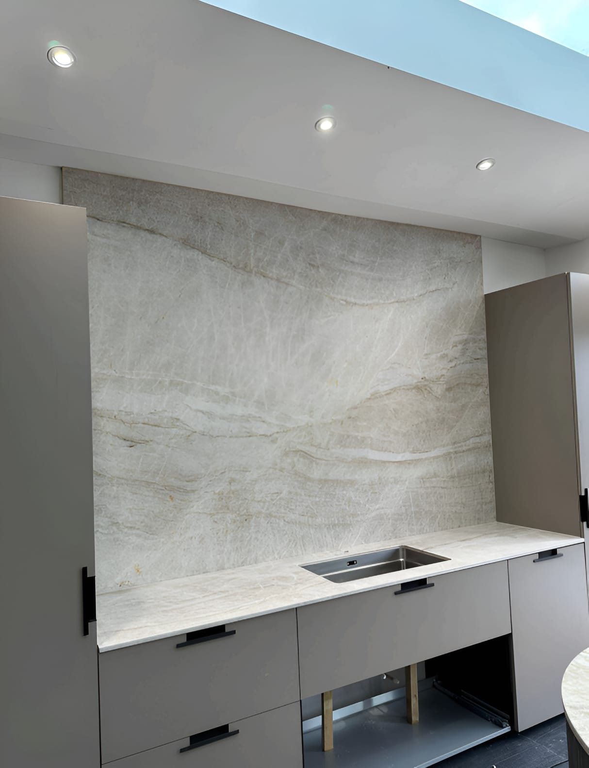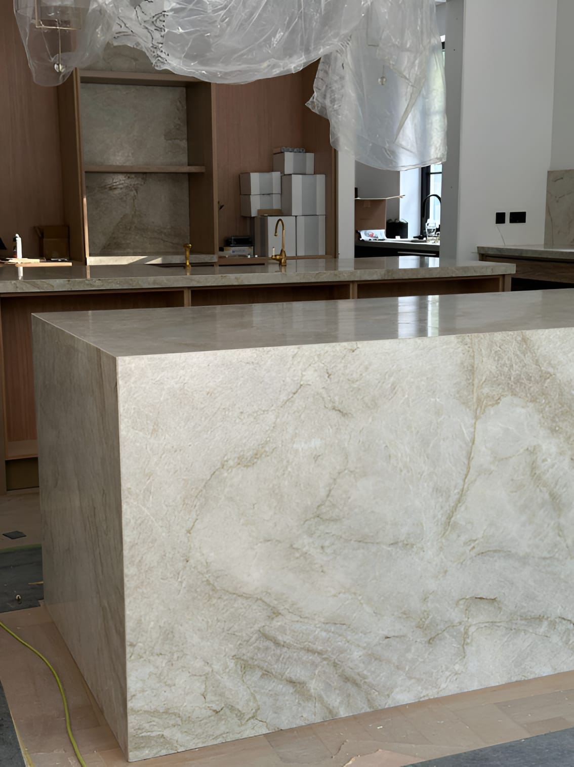 This project features a Taj Mahal Quartzite kitchen, selected for its warm cream tones and subtle veining, creating a soft and elegant finish throughout the space.