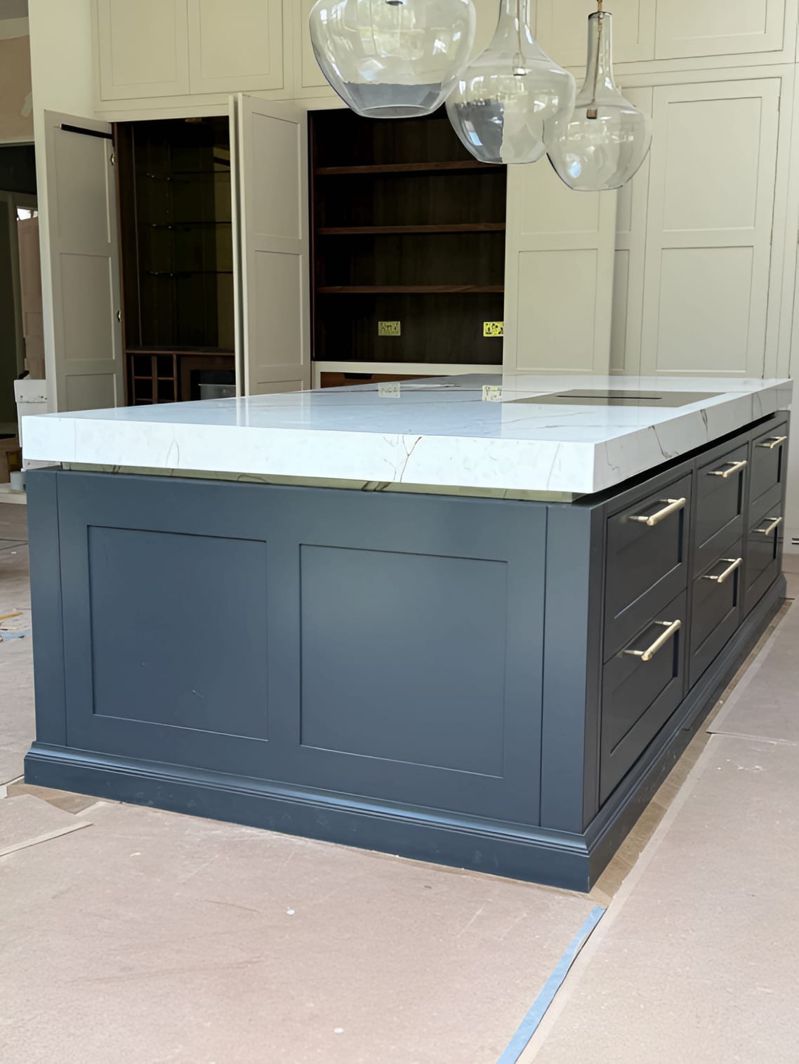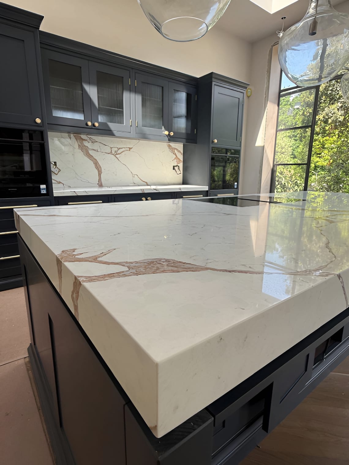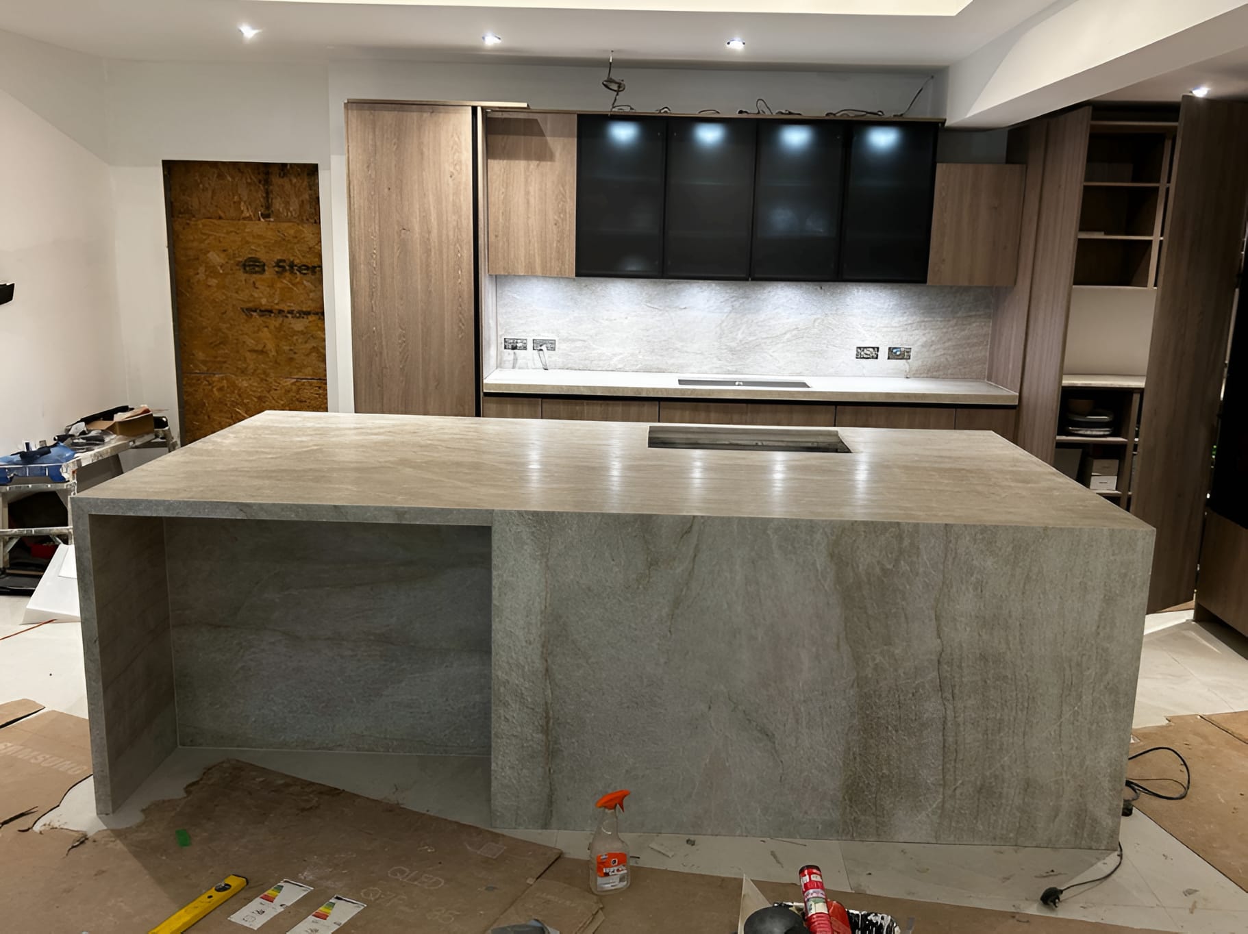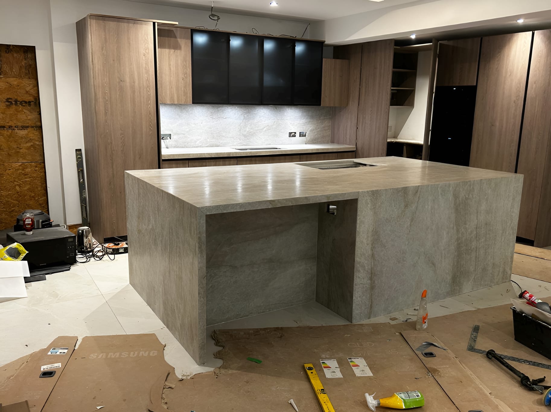 The scope included full templating, fabrication, and installation of the main worktops, a large feature island with downstands and full cladding, and full-height splashbacks with precision socket cut-outs.