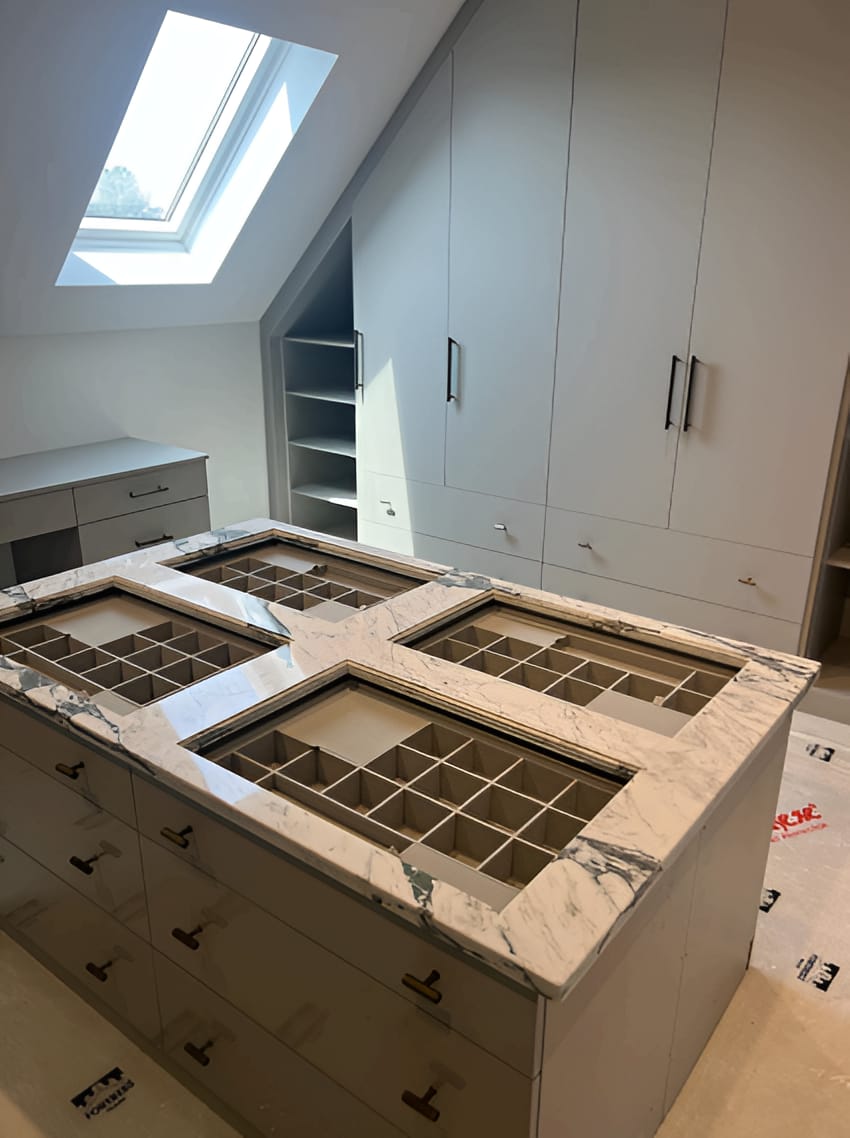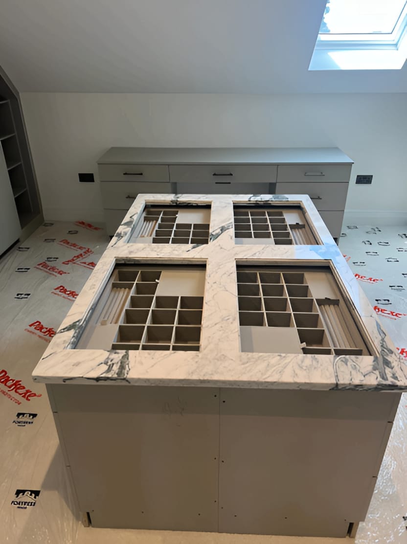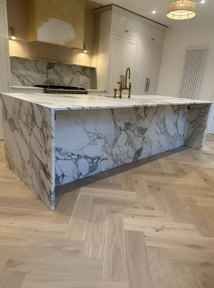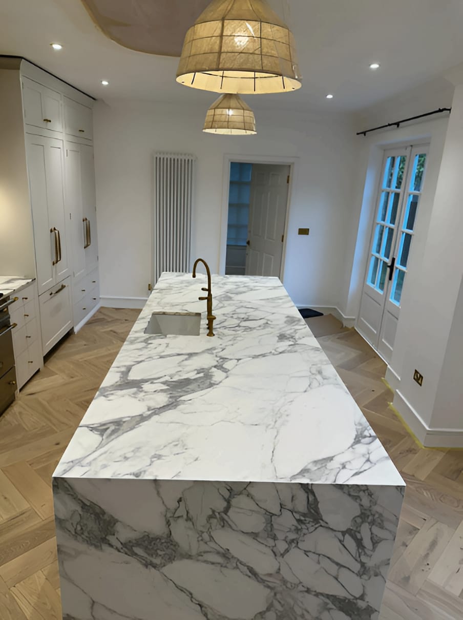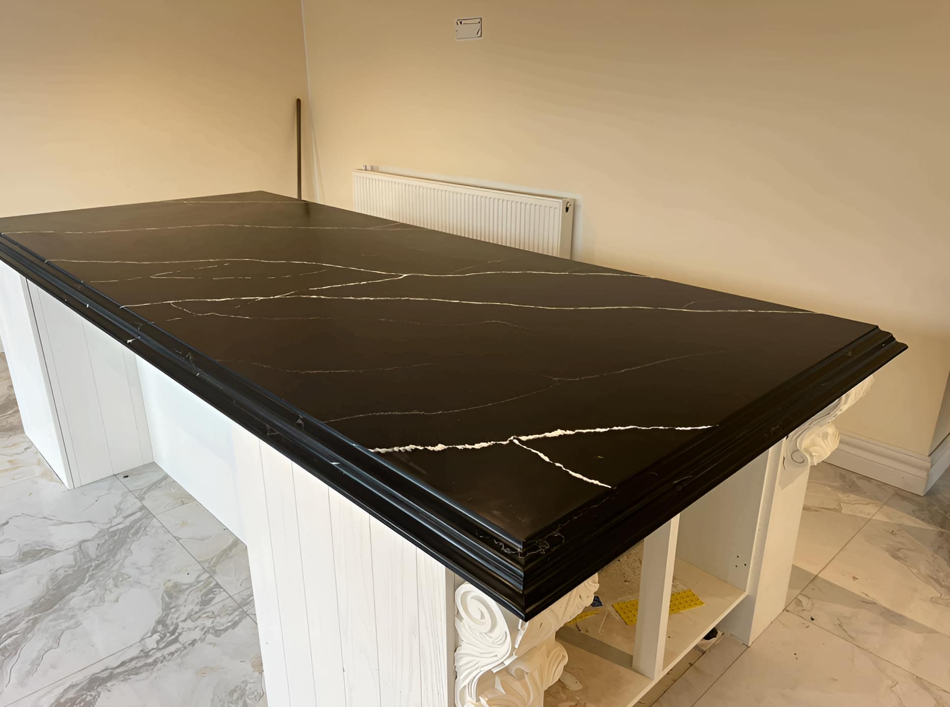 The scope included full templating, fabrication, and installation of the main worktops, a large feature island with downstands and full cladding, and full-height splashbacks with precision socket cut-outs.
