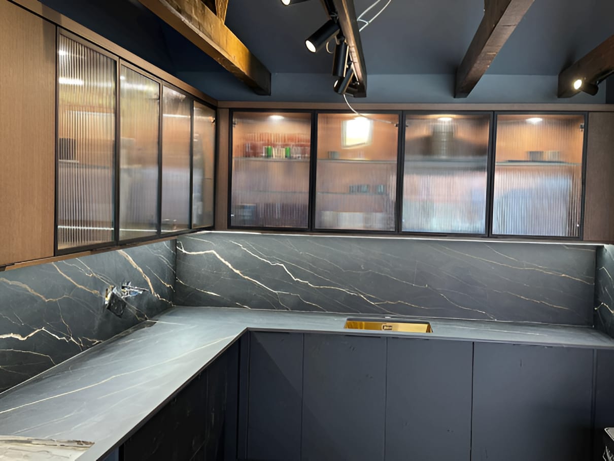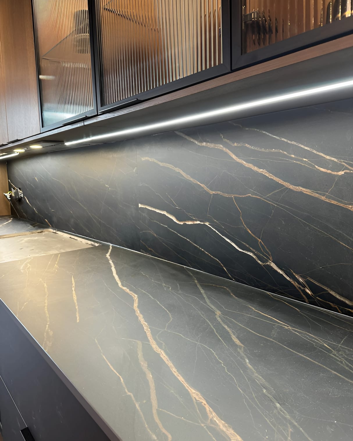 The installation included full-height splashbacks, a double-edge profile, and integrated functional features.