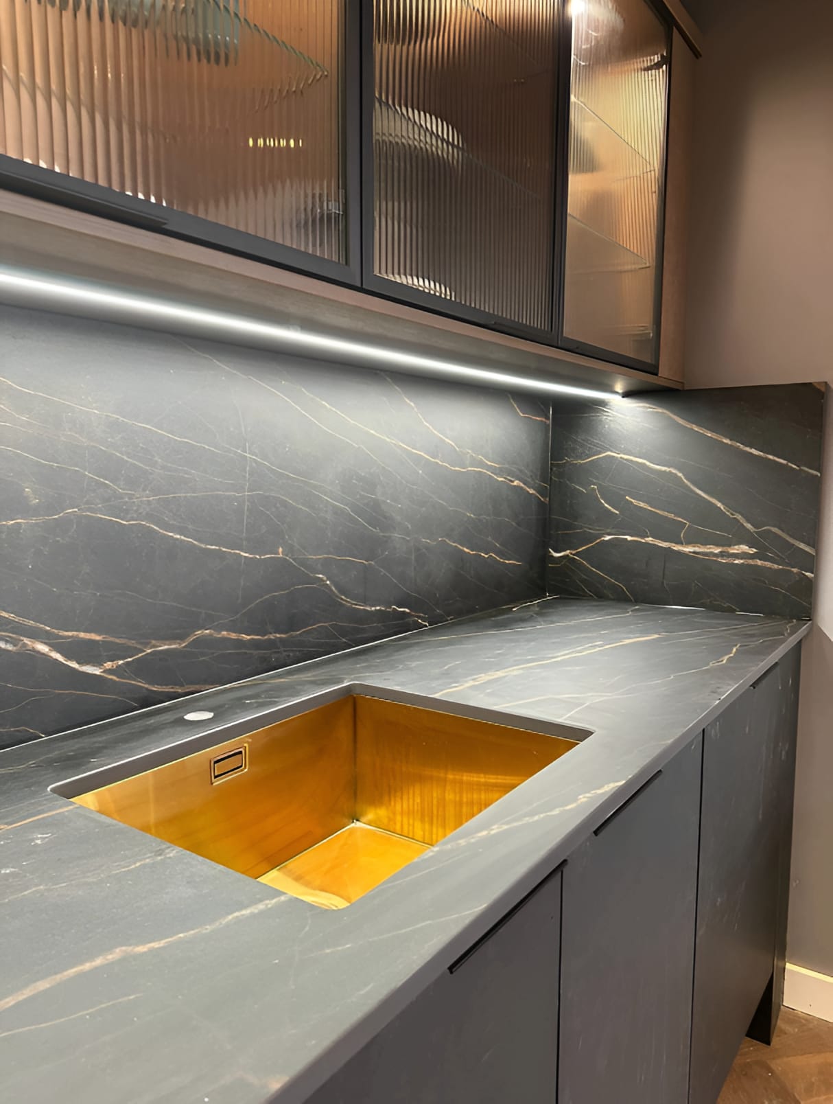 A bold and contemporary kitchen featuring Sahara Noir, with deep black tones and fine veining.