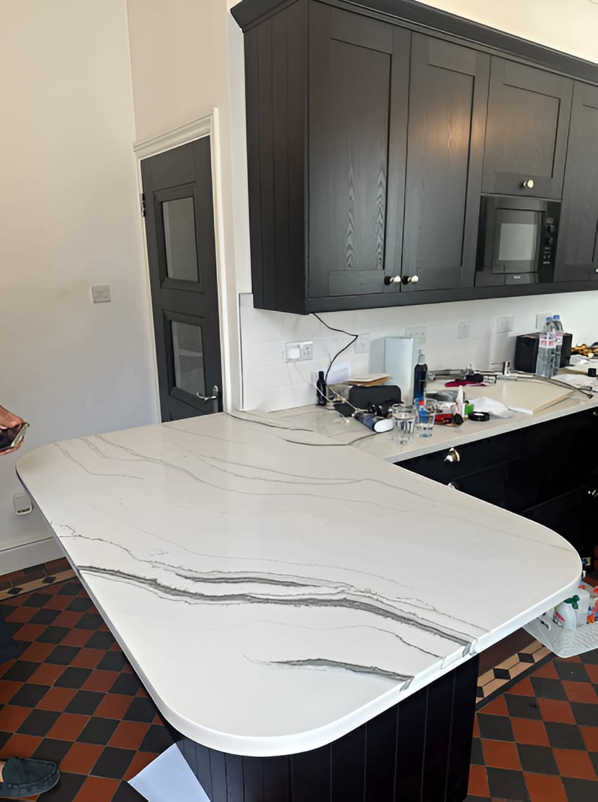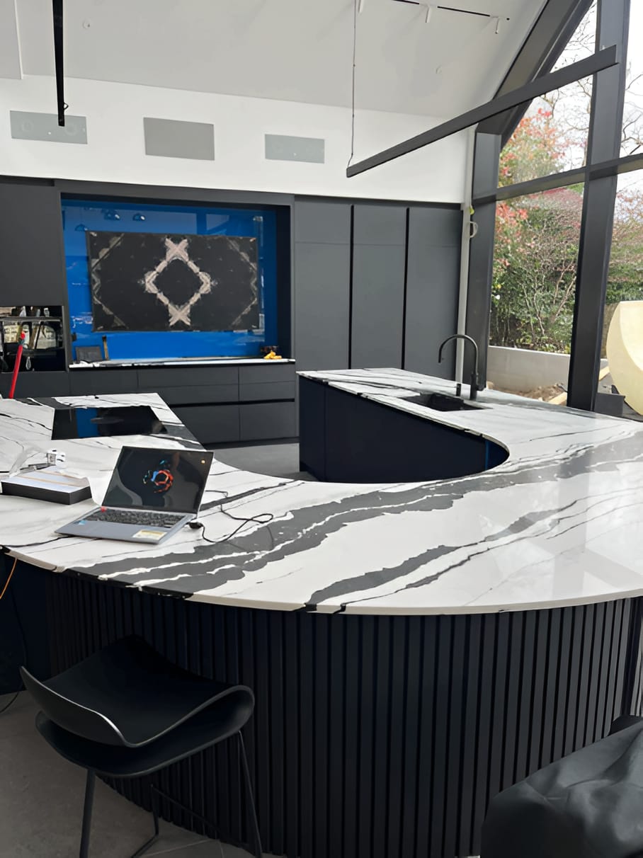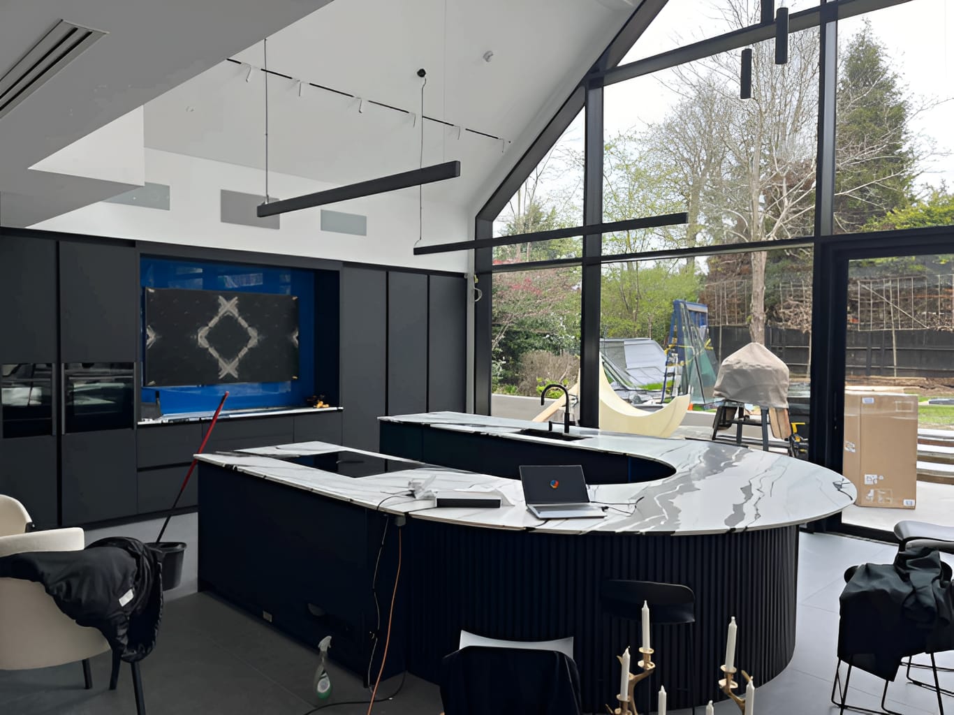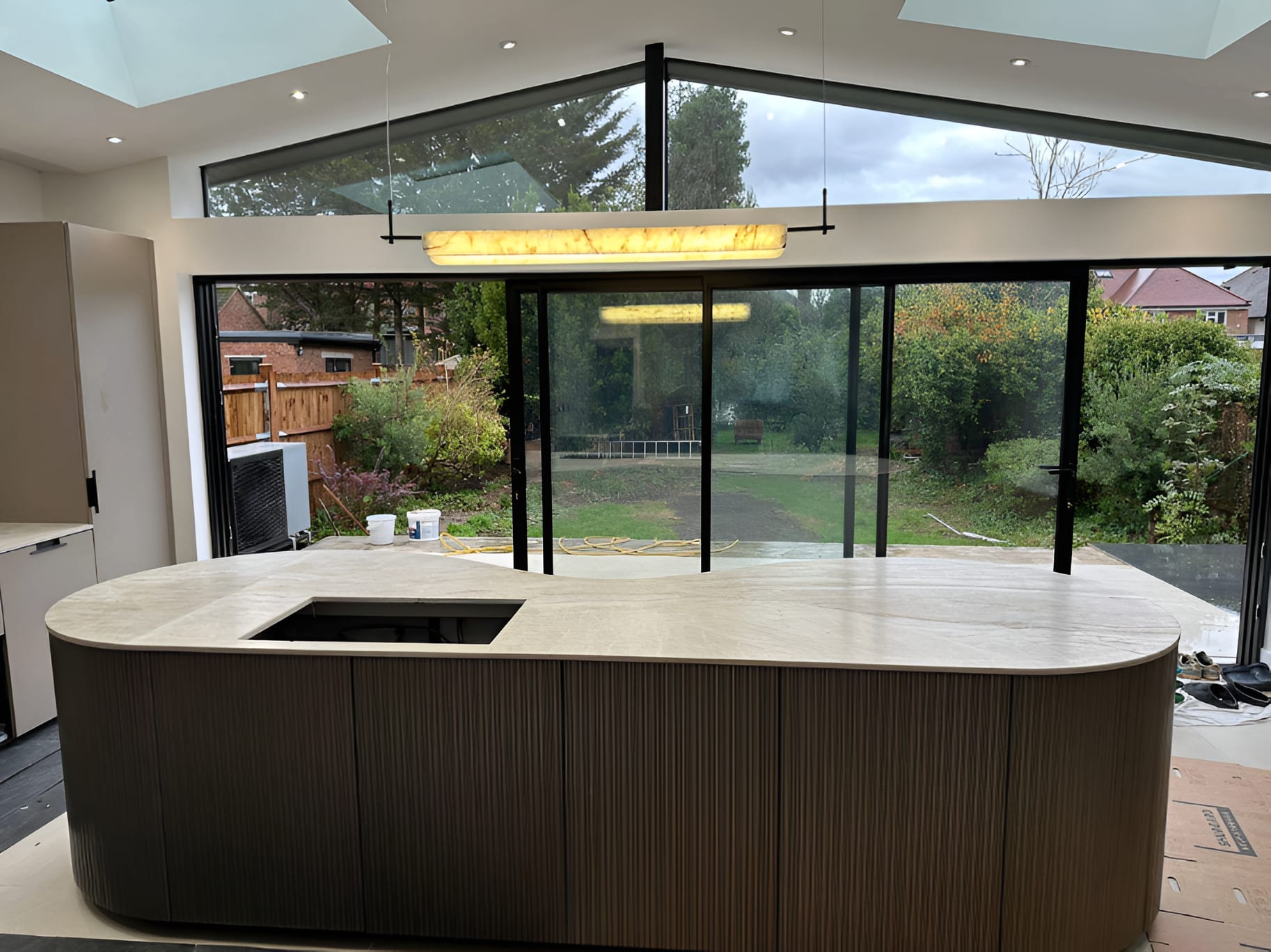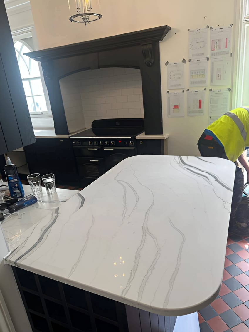 The scope included a rounded island with integrated hob cut-out, along with full worktop runs and splashbacks.