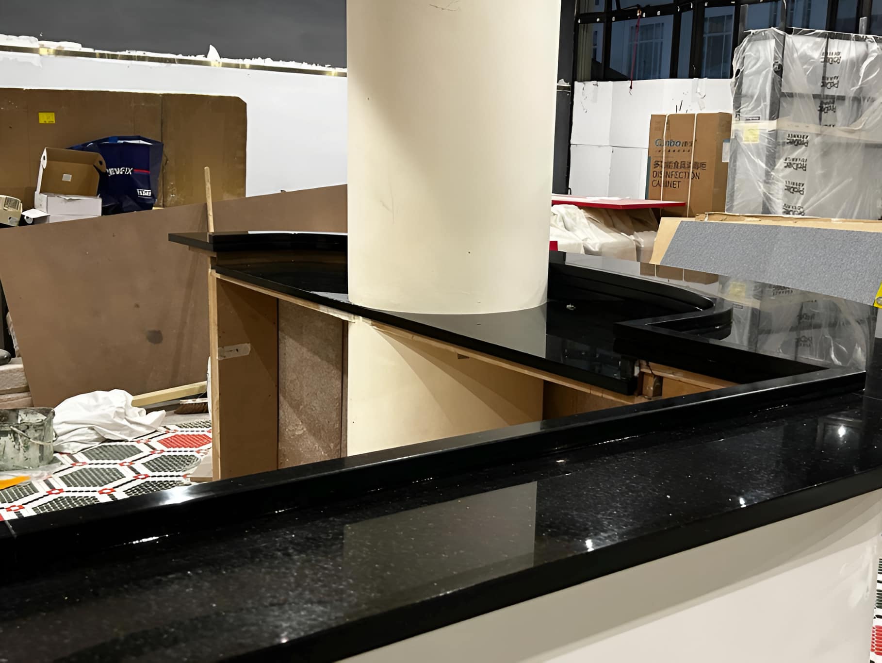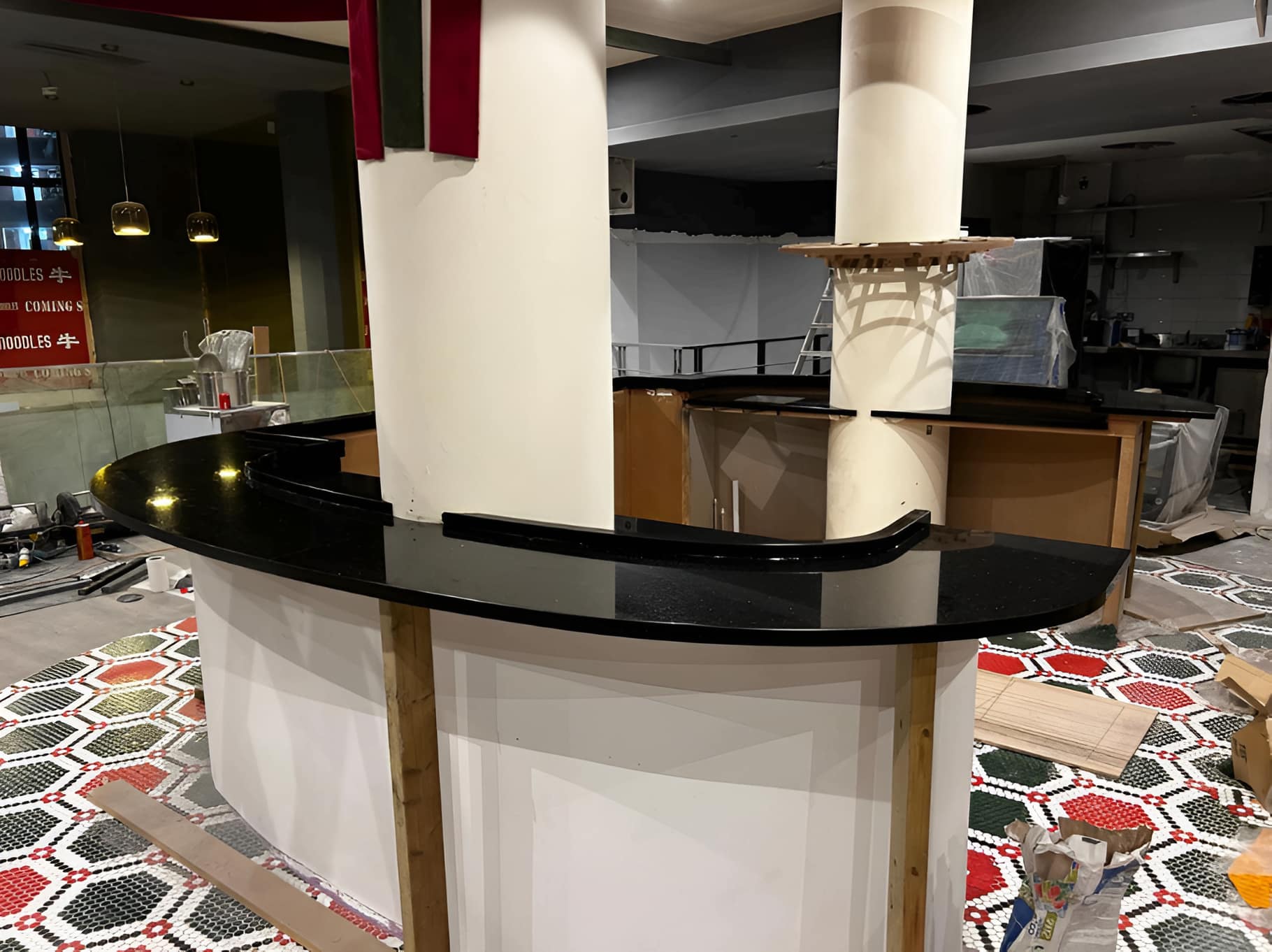 This commercial bar installation features Absolute Black Granite, chosen for its durability and sleek, polished appearance.