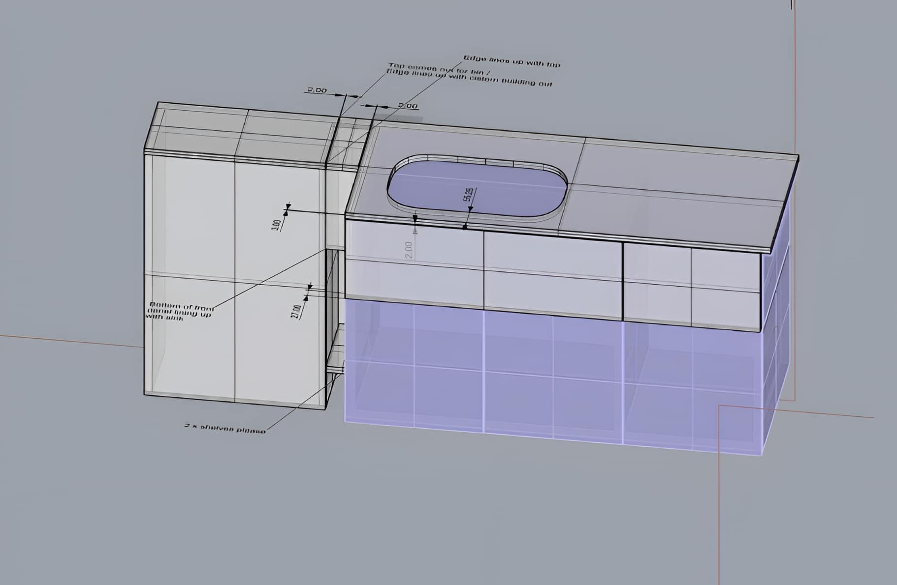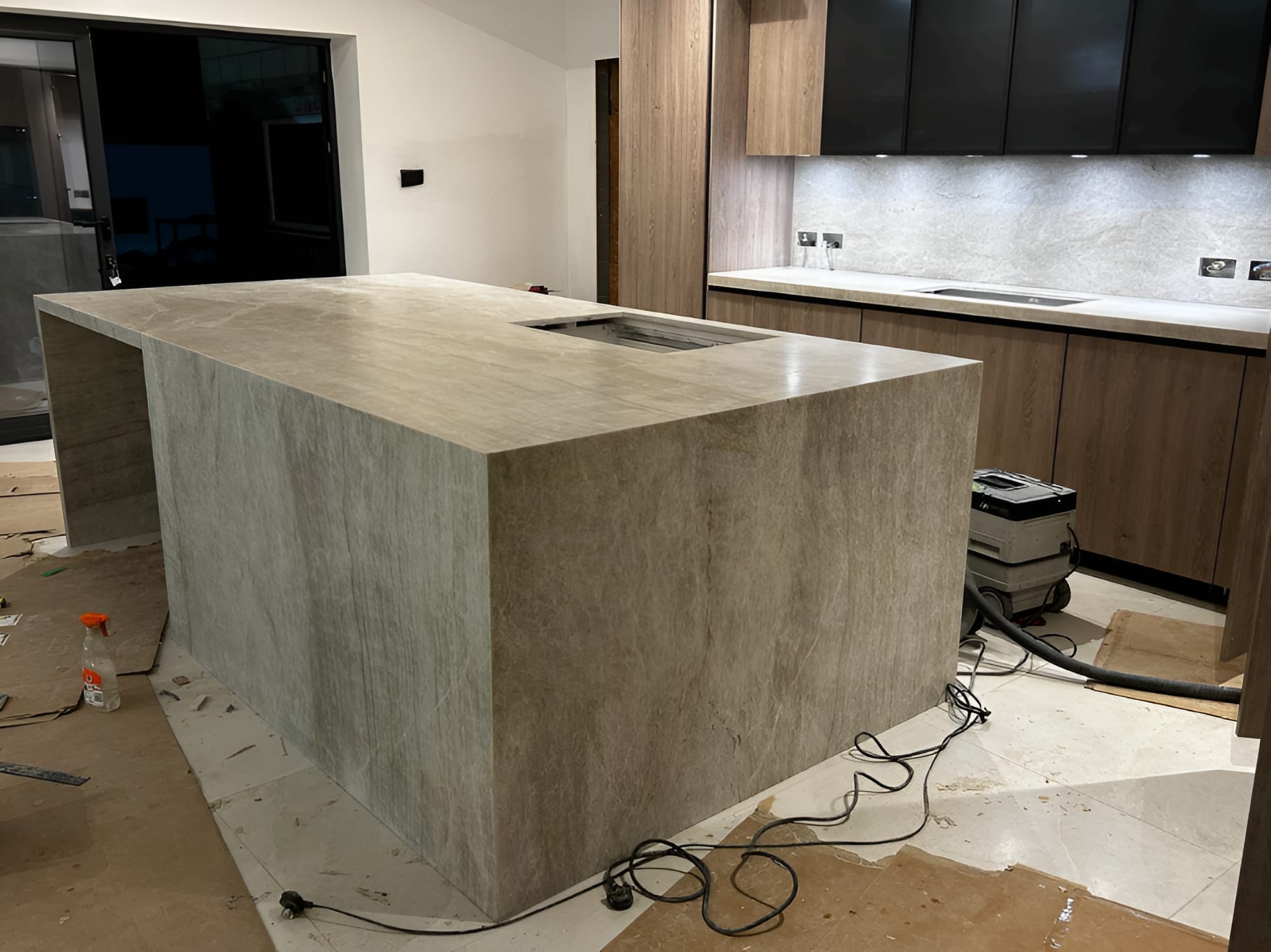 Key elements included drainer grooves, a polished undermount sink cut-out, tap hole, and hob cut-out. The island was designed as a central statement piece with seamless stone wrapping.