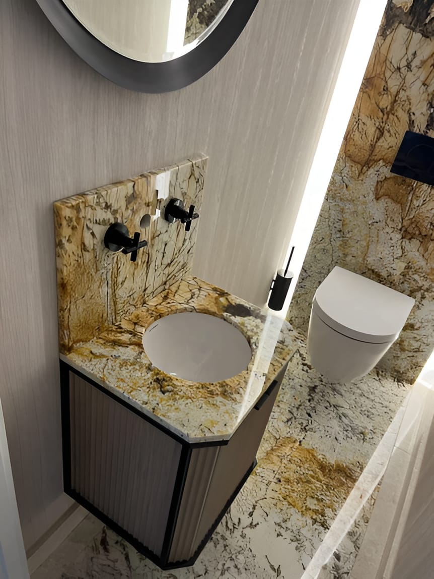 The continuity of material between kitchen and bathroom creates a cohesive interior design.