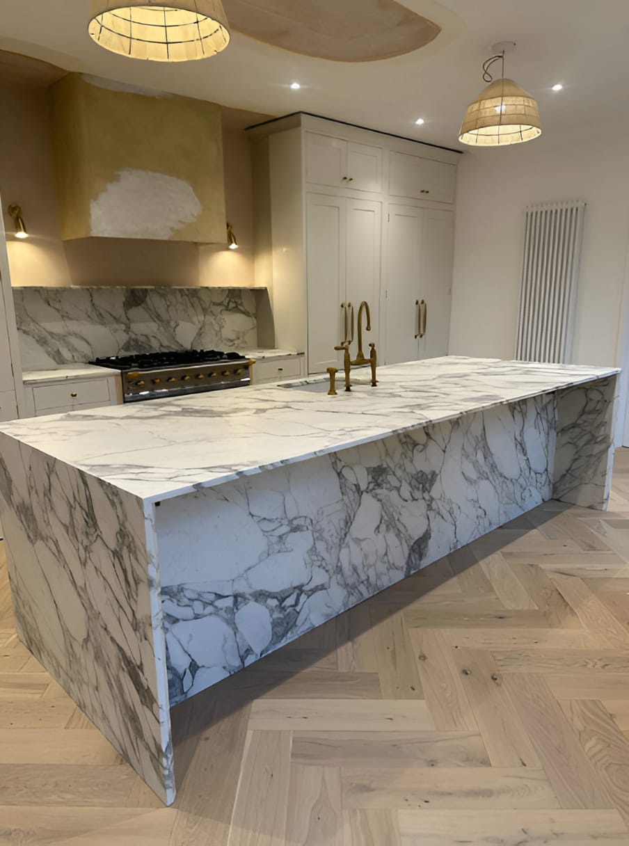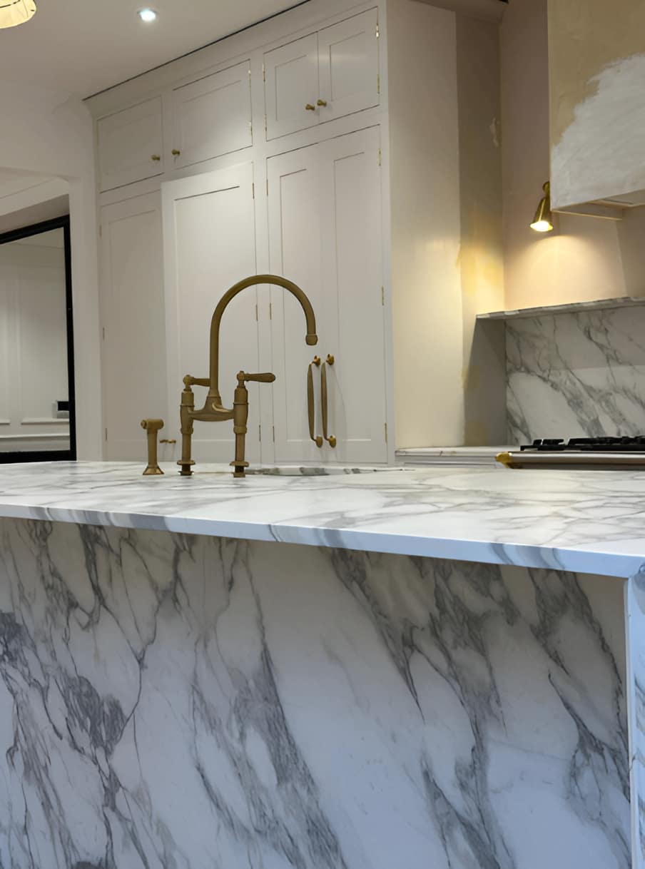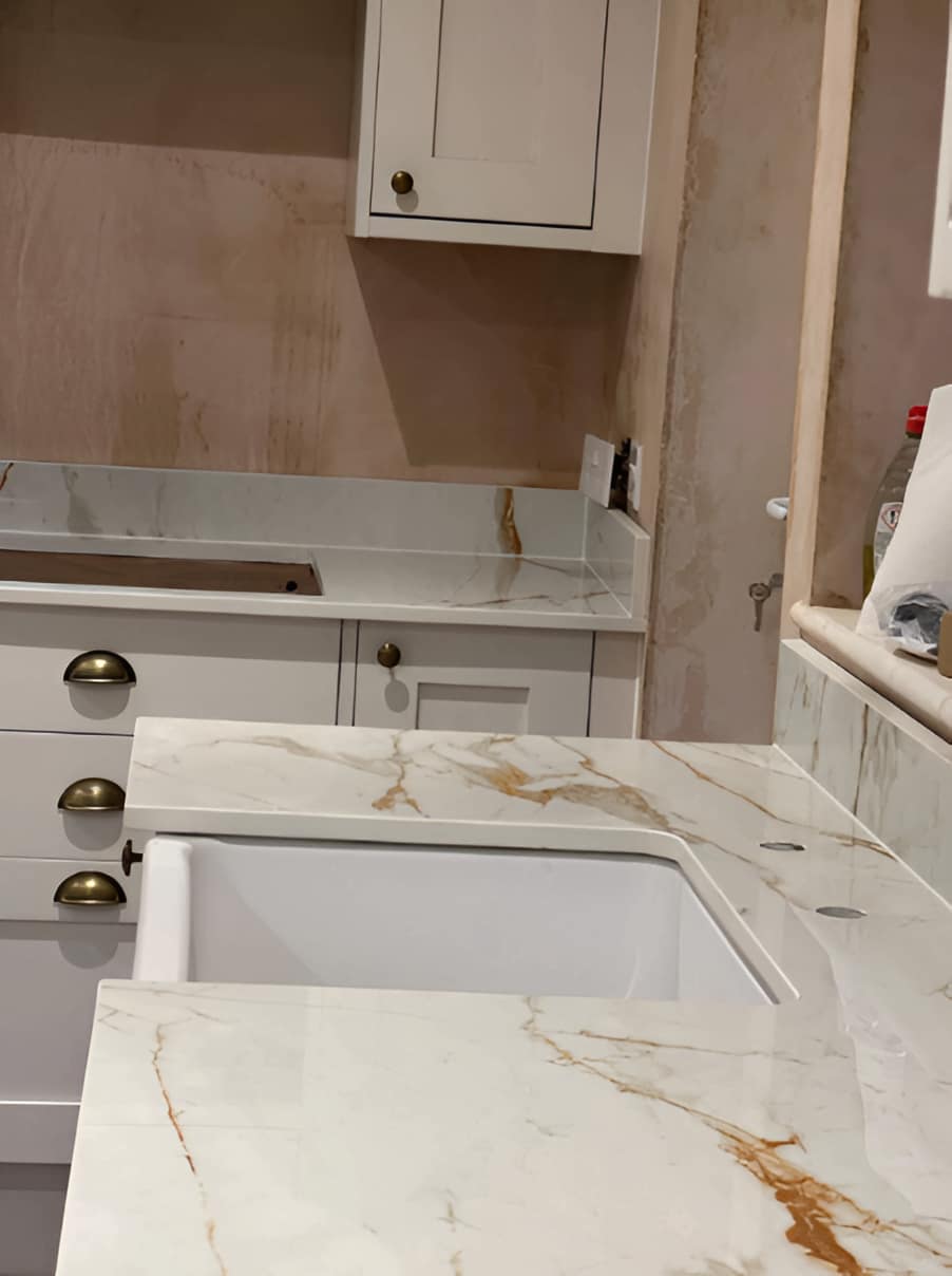Kitchen worktops in Calacatta Gold quartz, selected for its elegant white base and warm veining.