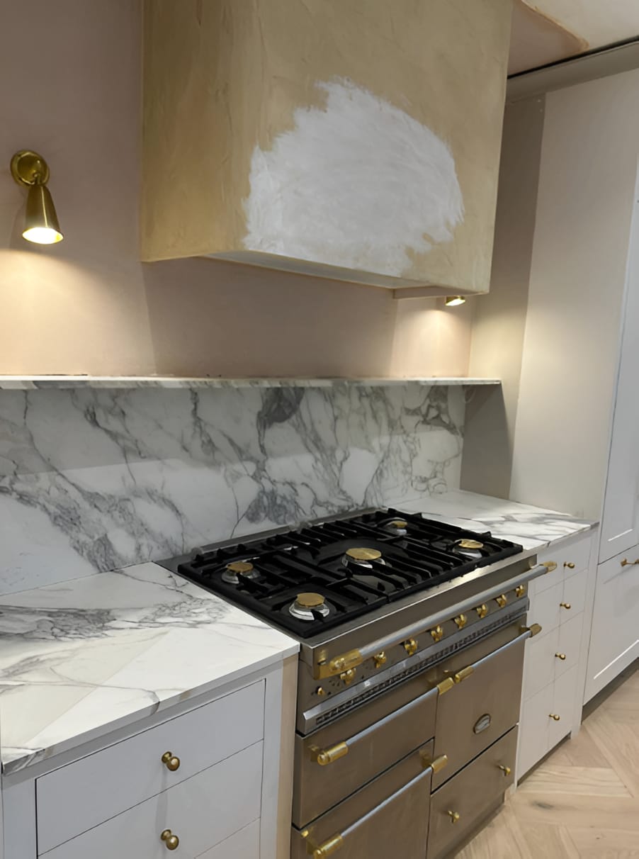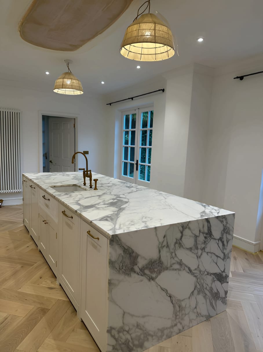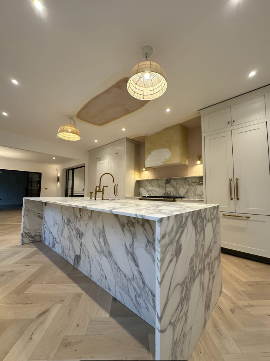 Kitchen worktops in Calacatta Gold quartz, selected for its elegant white base and warm veining.