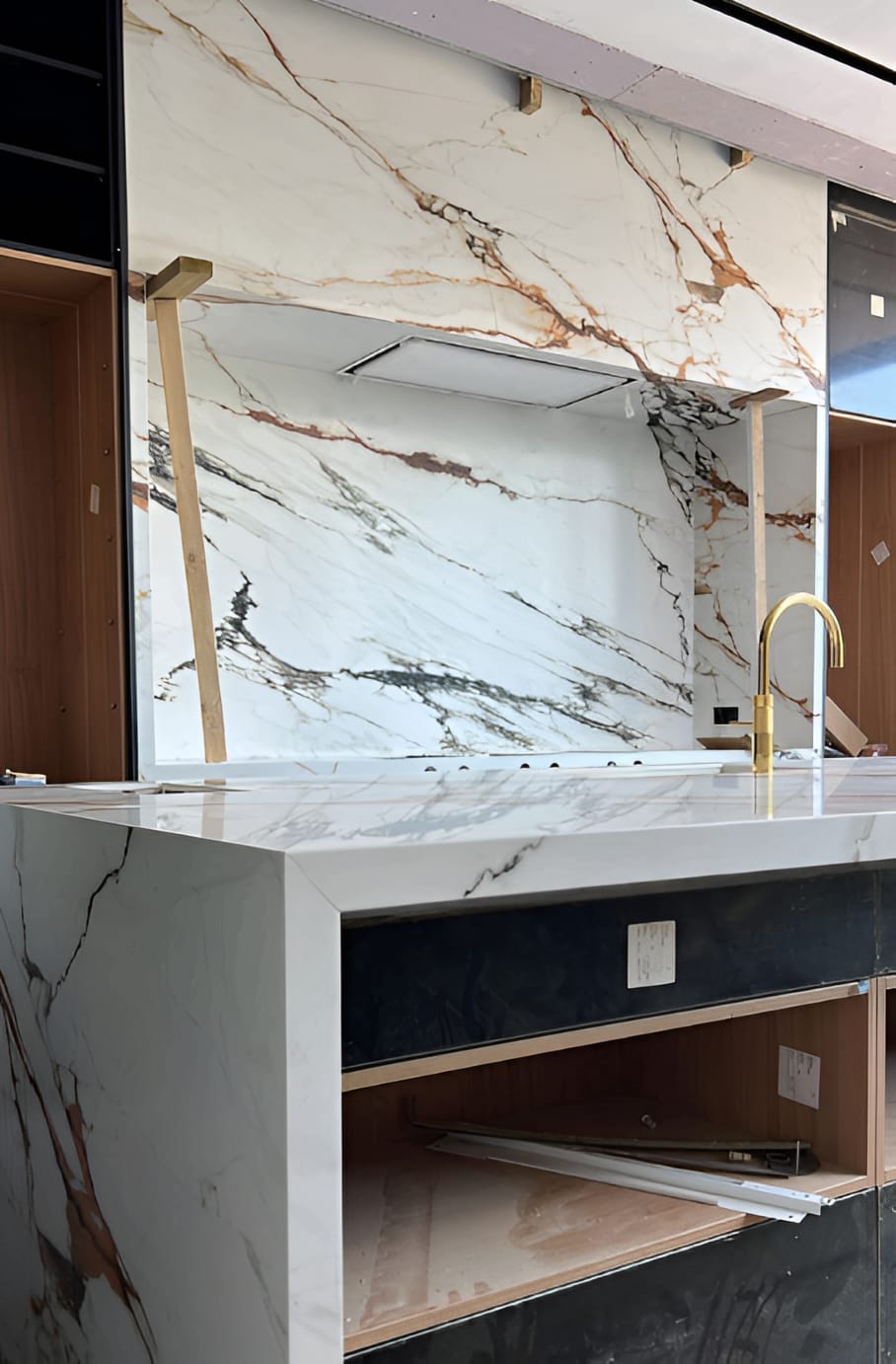 The project included a waterfall island, full-height splashbacks with socket cut-outs, and precise fabrication of all cut-outs.